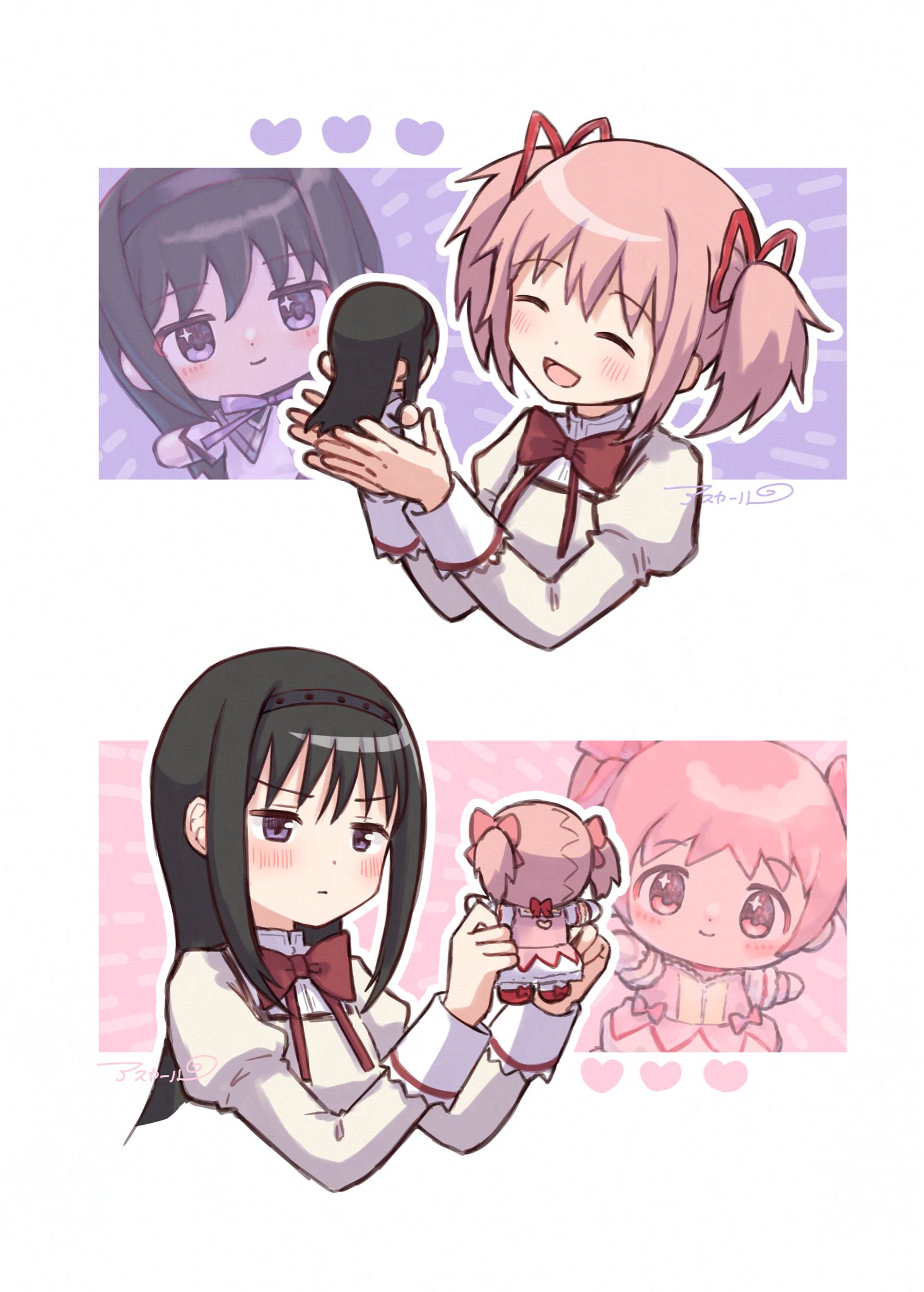 :d1boy2girlsblack hairblack hairbandblushbowbowtiecharacter dollchibiclosed eyesclosed mouthcropped torsodollhair ribbonhairbandholdingholding dolljuliet sleeveslong hairlong sleevesmitakihara school uniformmultiple girlsopen mouthoutlinepink hairpuffy sleevespurple eyesred bowred bowtiered ribbonribbonschool uniformshirtshort hairshort twintailssidelockssimple backgroundsmiletwintailswhite backgroundwhite outlineyellow shirt