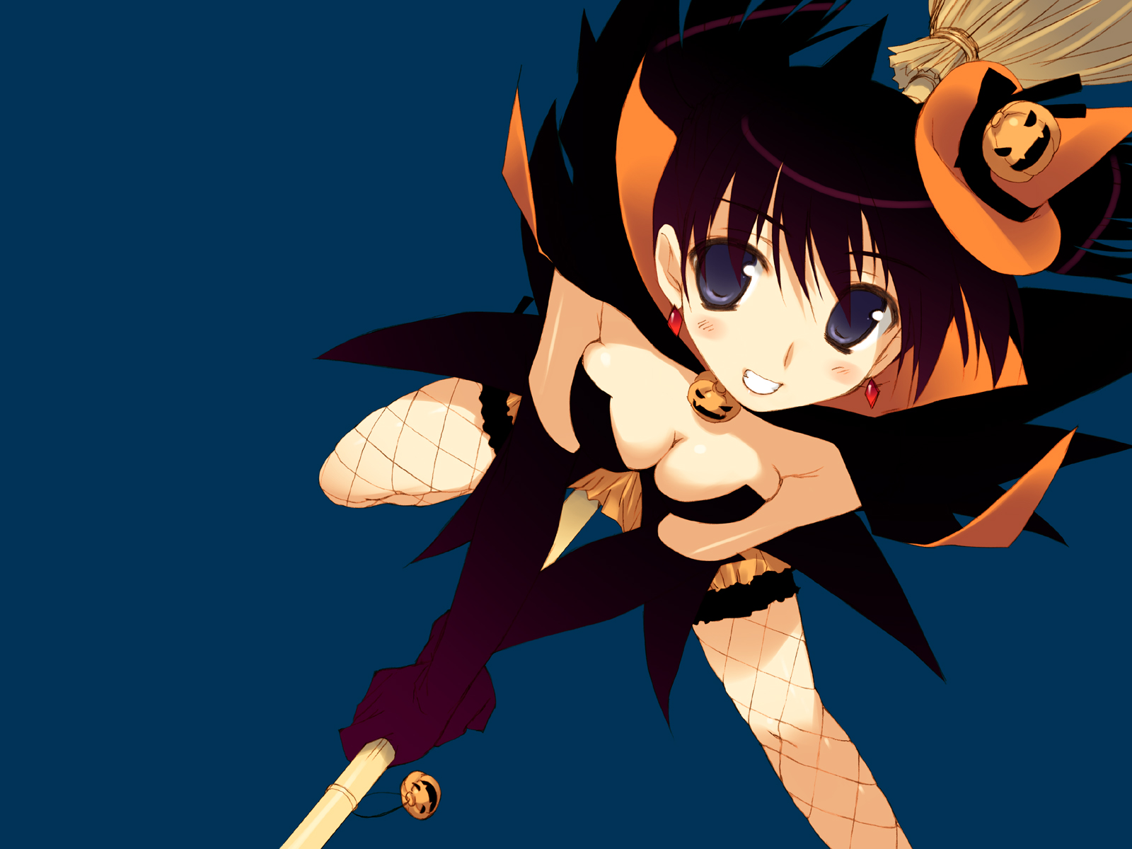 1girlblue eyesbreastscleavageelbow glovesfemale focusfishnet pantyhosefishnetsfood-themed hair ornamentglovesgrinhair ornamenthalloweenhatjack-o'-lanternlarge breastspantyhosepumpkinpumpkin hair ornamentpurple hairsmilesolowitchwitch hat