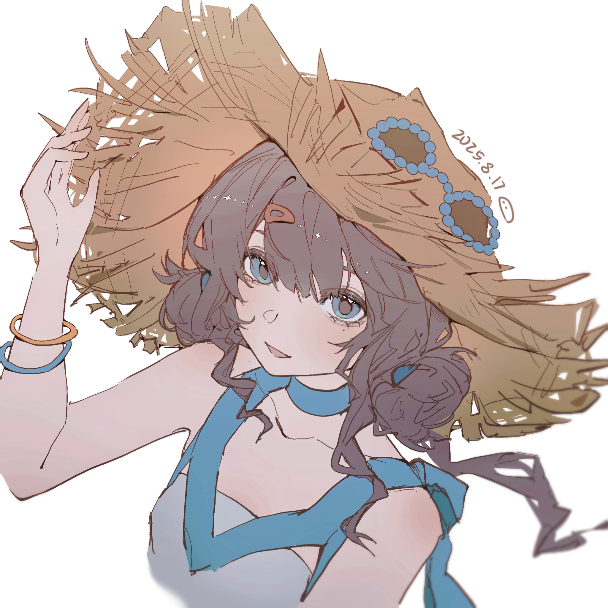 :d1girlbare armsbare shouldersbraceletbrown hairbrown hatcropped torsodateddresseyewear on headwearhand uphatjewelrylooking at viewerofficial alternate costumeopen mouthsleevelesssleeveless dresssmilesolostraplessstraw hatsunglassestube topupper bodyvery low bunwhite backgroundwhite tube topyiyi jiang si le