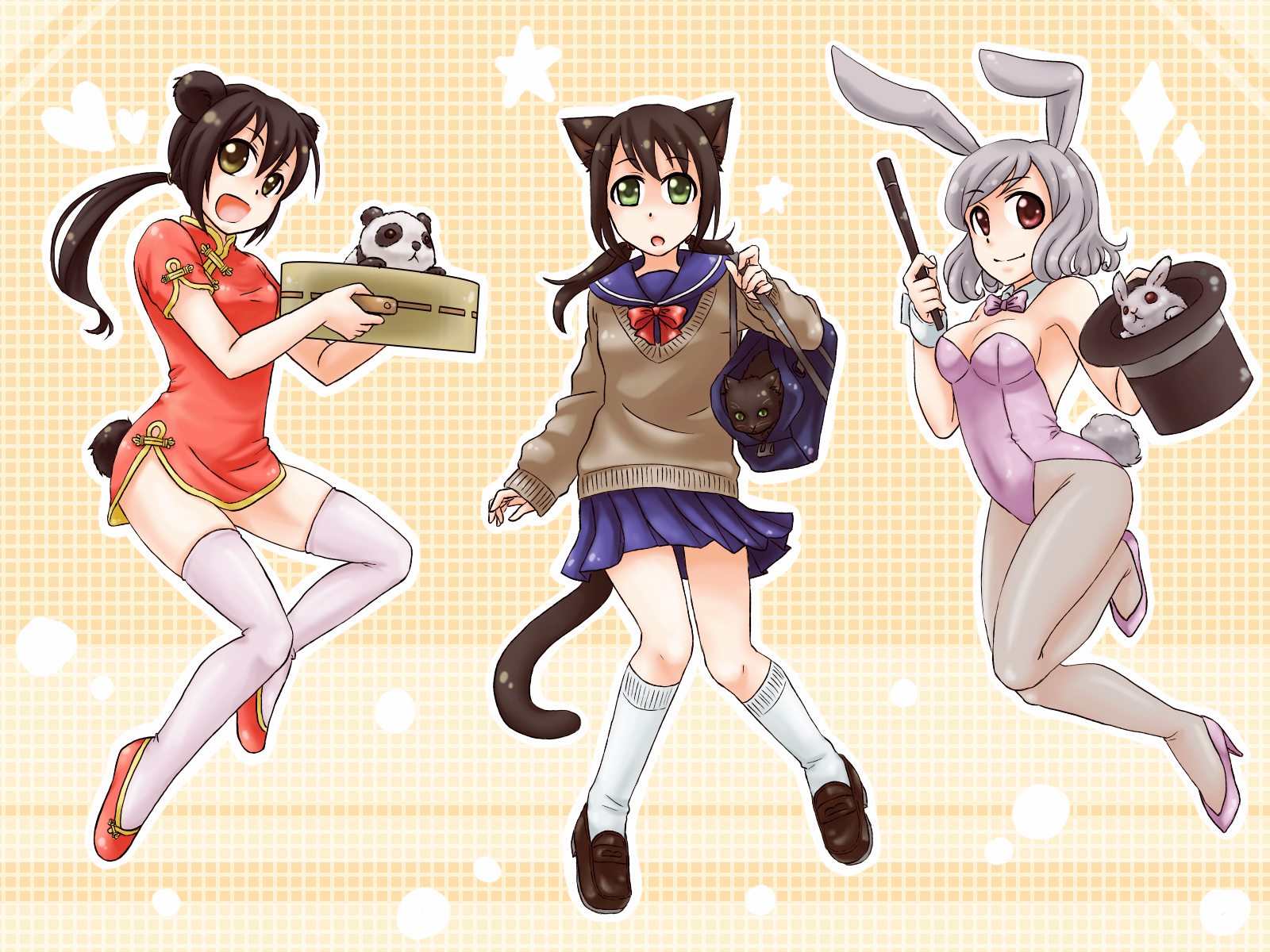 3girlsanimal earsbagbear tailblack hairbrown eyescatcat earscat tailchina dresschinese clothesdressfake animal earsgreen eyeshathigh heelslong hairlow twintailsmultiple girlspandapanda earspanda tailpantyhoseplayboy bunnyponytailrabbitrabbit earsred eyesschool uniformserafukushoesshort hairtailthighhighstop hattwintailswand