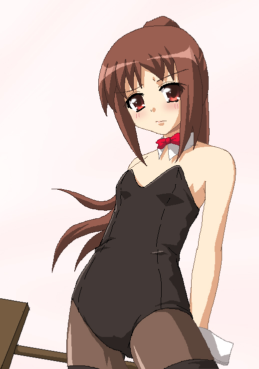 00s1girlblushbowbowtiebrown hairfemale focusflat chestgenderswaplong hairpantyhoseplayboy bunnyponytailsignsolothighband pantyhose