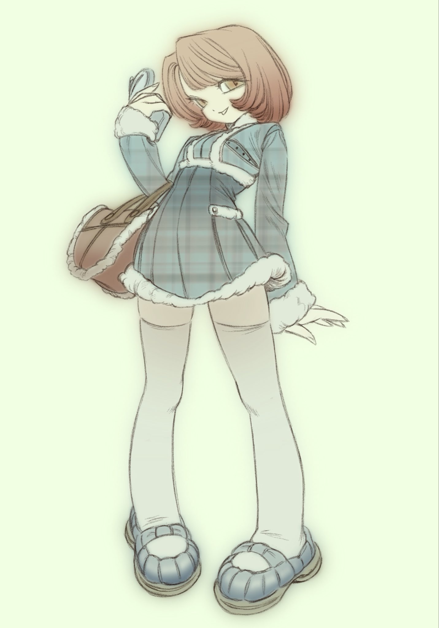 1girlbagbrown haircheckered clothescoatdressfull bodyfur trimgreen backgroundhandbaglong sleevesshort hairsimple backgroundsmilesolostandingthighhighszettai ryouiki