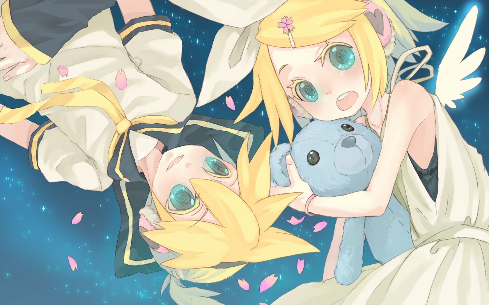 1boy1girlaqua eyesbare shouldersbearblonde hairbraceletbrother and sistercoupledetached sleevesdresshair ornamenthair ribbonhairclipheadphonesheterojewelryribbonshort hairsiblingsstuffed animalstuffed toytwinswings