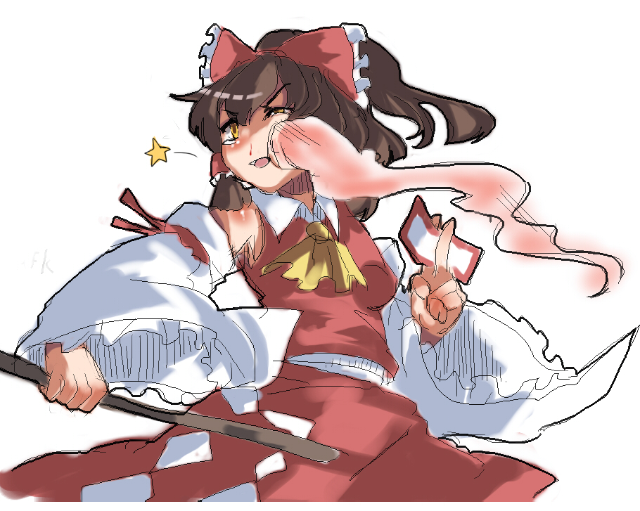 armpitsbloodbowbrown hairdetached sleevesgoheiin the facejapanese clothesmikono nosenosebleedofudapunchingsimple backgroundsketchsolostar (symbol)tearswhite backgroundyellow eyes
