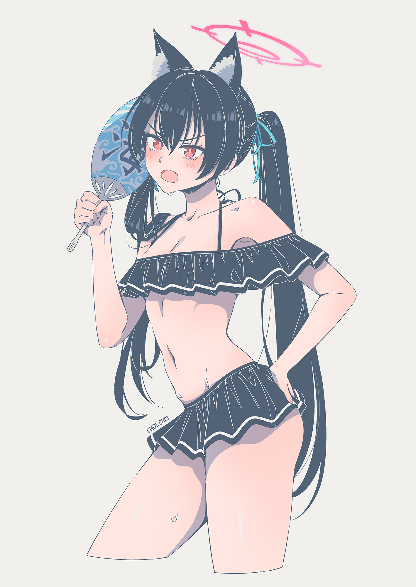 1girlartist namebikinibreastsgrey backgroundhalohalo behind headmedium breastssimple backgroundsoloswimsuit