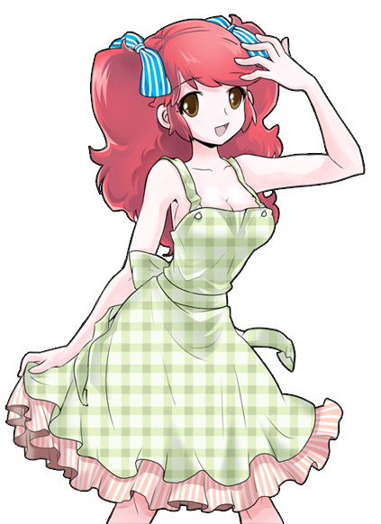 1girlbreastscleavagecurvydressfemale focuslarge breastslong hairopen mouthred hairribbonsimple backgroundsmilesolotwintailswhite backgroundyellow eyes
