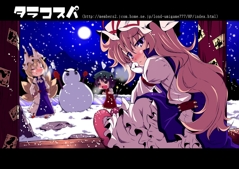3girlsanimal hatblonde hairblushbrown hairdressfemale focusfrilled dressfrillsfull moonhand on own facehands on own hipshathat ribbonletterboxedlong hairlong sleeveslooking at viewermob capmoonmultiple girlsmultiple tailsnightoutdoorspurple eyesribbonshoessnowsnowingsnowmantailtassel