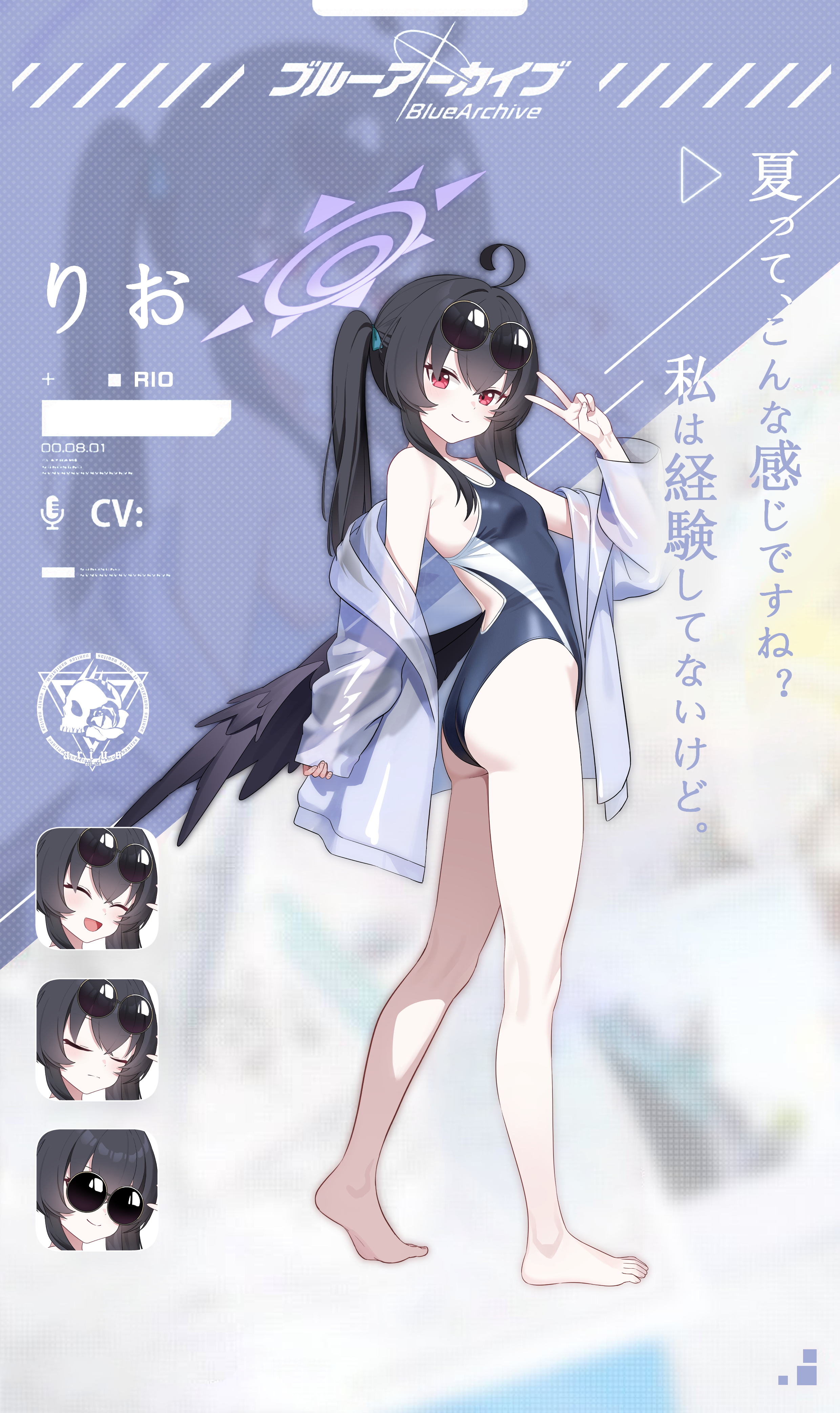 :d1boy1girlahogeassback cutoutbare shouldersbarefootblack hairblack wingsblue one-piece swimsuitblurryblurry backgroundblushbreastscharacter nameclosed eyesclosed mouthclothing cutoutcompetition swimsuitcopyright logocopyright nameeyewear on headfeathered wingsfrom sidefull bodyhair between eyeshalohand uphappyheel uphighleghighleg one-piece swimsuitjacketlegslogolong hairlong sleeveslooking at viewerlow wingsmicrophone symbolmultiple expressionsoff shoulderone-piece swimsuitopen clothesopen jacketopen mouthpinching sleevespurple halored eyesround eyewearsee-through clothessee-through jacketsidelockssingle sleeve past wristsmall breastssmilesolosplit mouthstandingsunglassesswimsuittoestsumiya riotwintailsvwingszoom layer