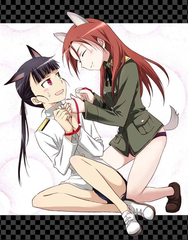 00s2girlsanimal earsclosed eyescuffsfalse smileheterochromiamultiple girlsno pantspantiesponytailsmiletailunderwearyuri