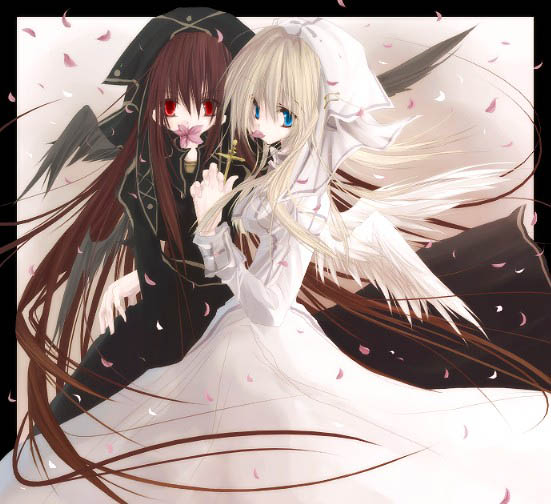angelangel wingsblack wingsblonde hairblue eyesbrown haircrossdressflowerhatlong hairpetalsred eyessiblingssisterstwinsvery long hairwings