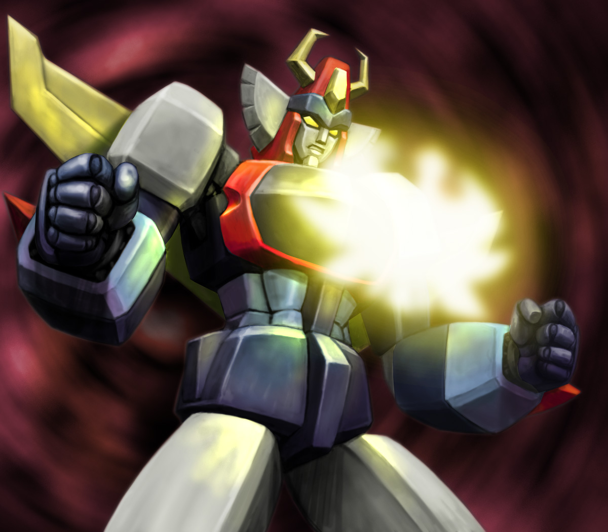 clenched handscowboy shotdark backgroundglowingmechano humansoldschoolpowering upretro artstylerobotsolostandingsuper robotyellow eyes