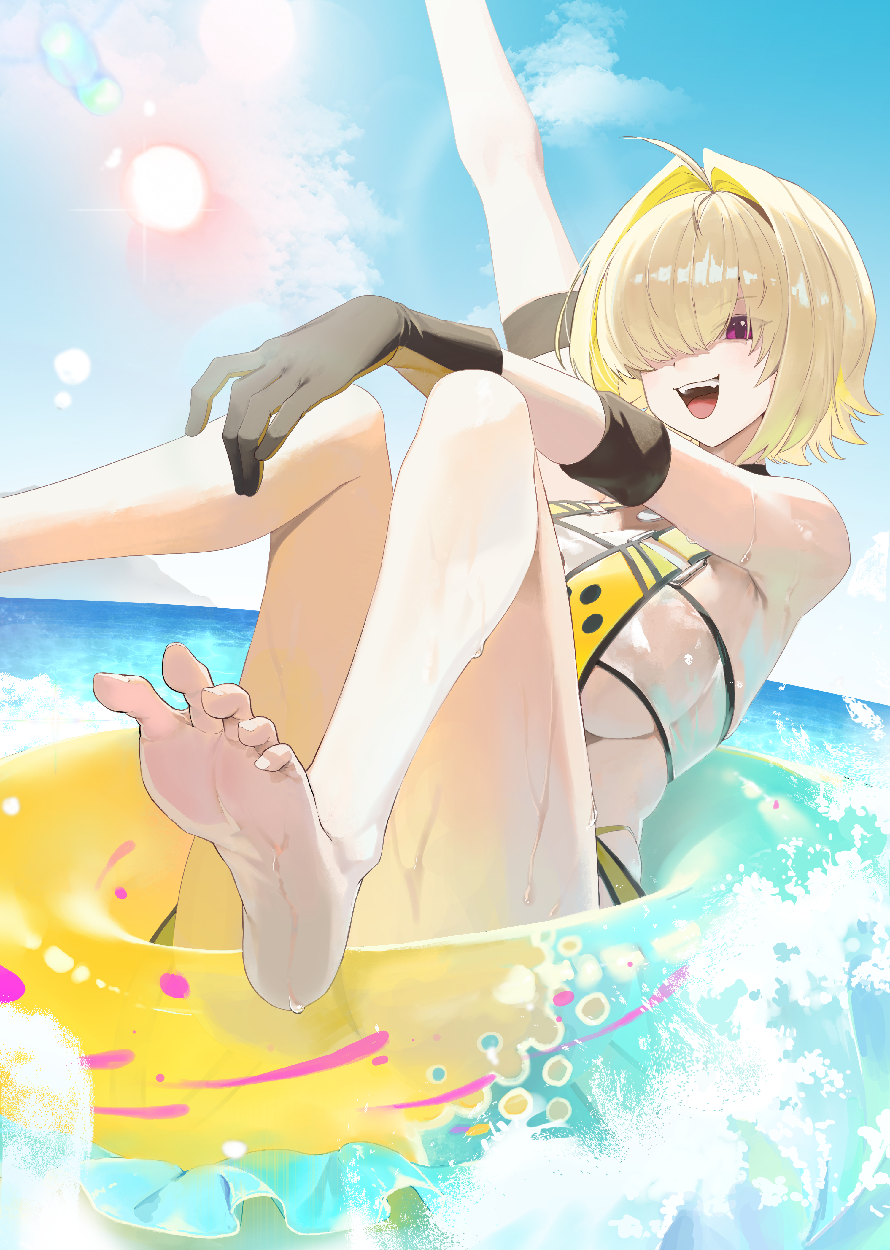 1girlahogebarefootbikiniblonde hairblushbreastschokerclothing cutoutdeopbabvilhair intakeshair over eyeshuge breastsinnertubelarge breastsnavelopen mouthshort hairslingshot swimsuitsmilesoloswim ringswimsuityellow slingshot swimsuit