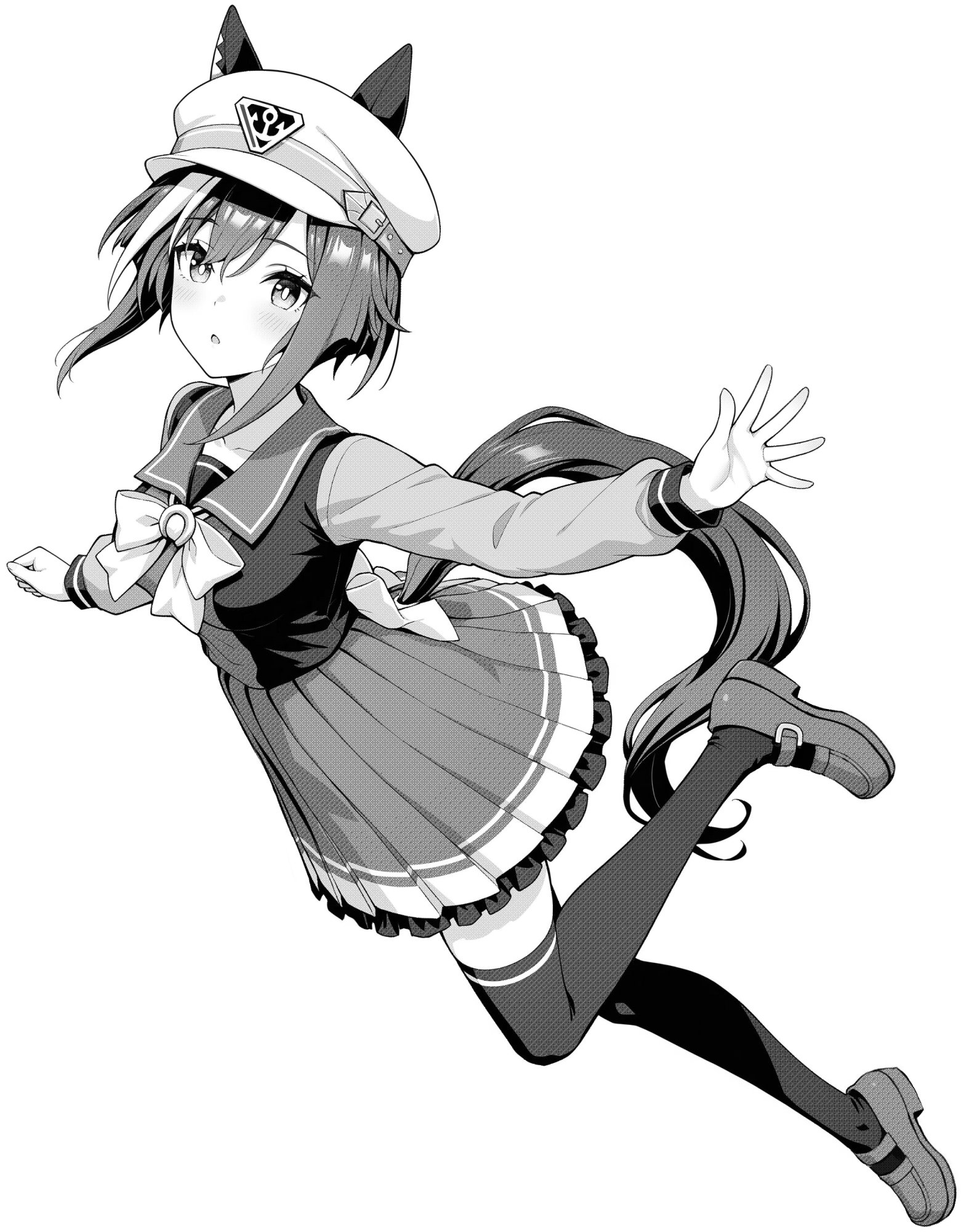1girlanimal earsblushbowears through headweargreyscalehair between eyeshathorse earshorse girlhorse taillooking at viewermonochromeopen mouthpleated skirtsailor collarschool uniformshirtshoesshort hairsidelocksskirtsolotailthighhighstracen school uniformzettai ryouiki