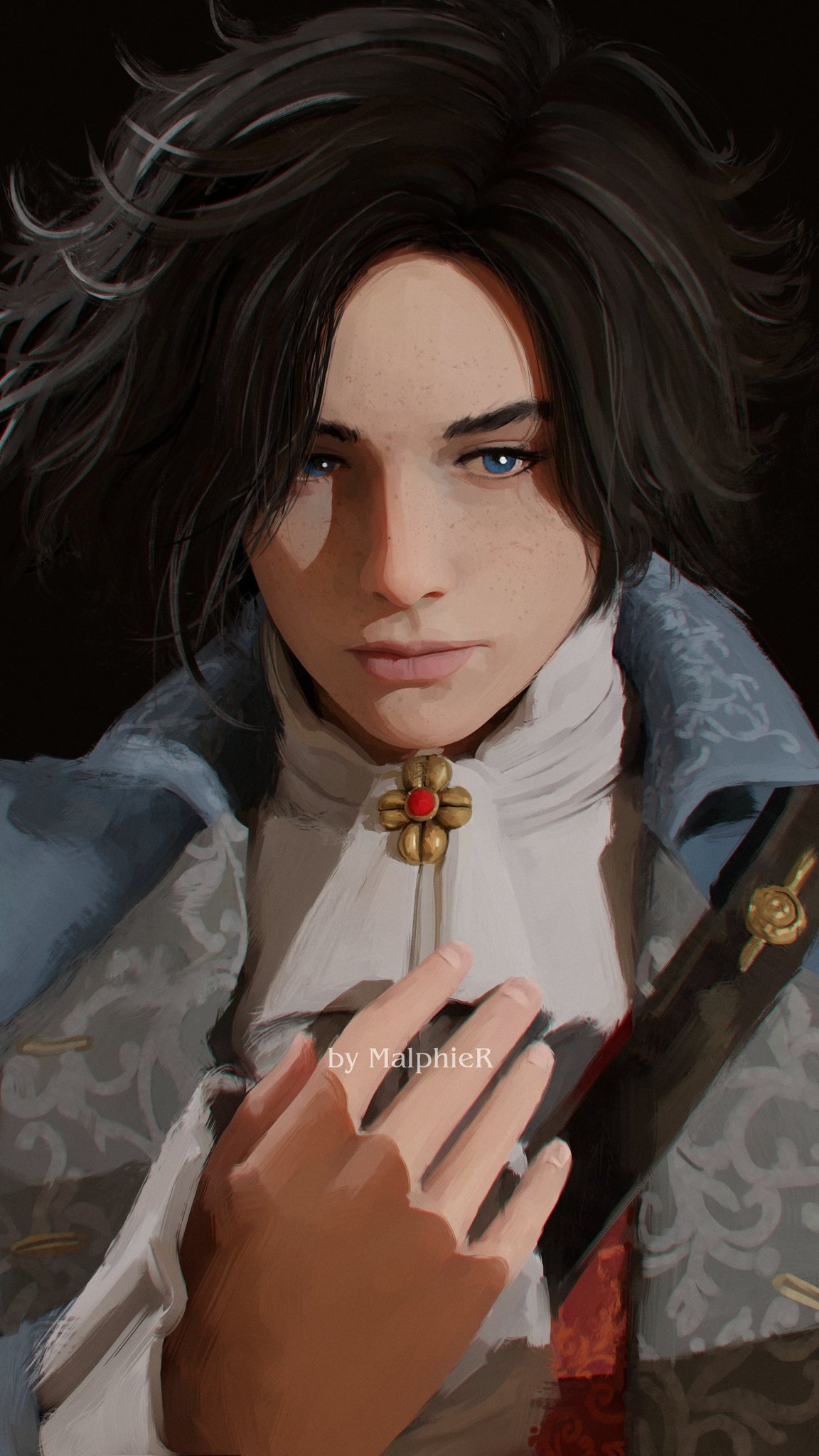 1boyartist nameascotblack backgroundblack hairblue coatblue eyescoateyelashesfrecklesmale focuspink lipssimple backgroundsolowhite ascot