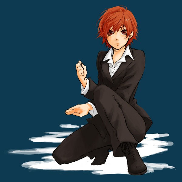 00s1girlandrogynousfemale focusformal clothespant suitpantsred eyesred hairreverse trapshort hairsimple backgroundsittingsolosquattingsuittomboy