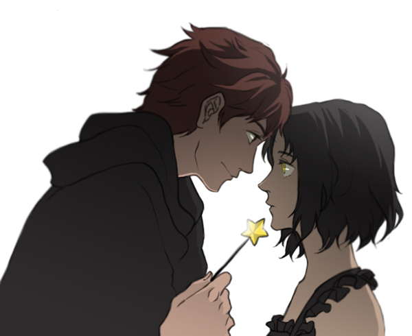 00s1boy1girlblack hairforehead-to-foreheadheads togetherred hairshort hairsmilestar (symbol)wandyellow eyes