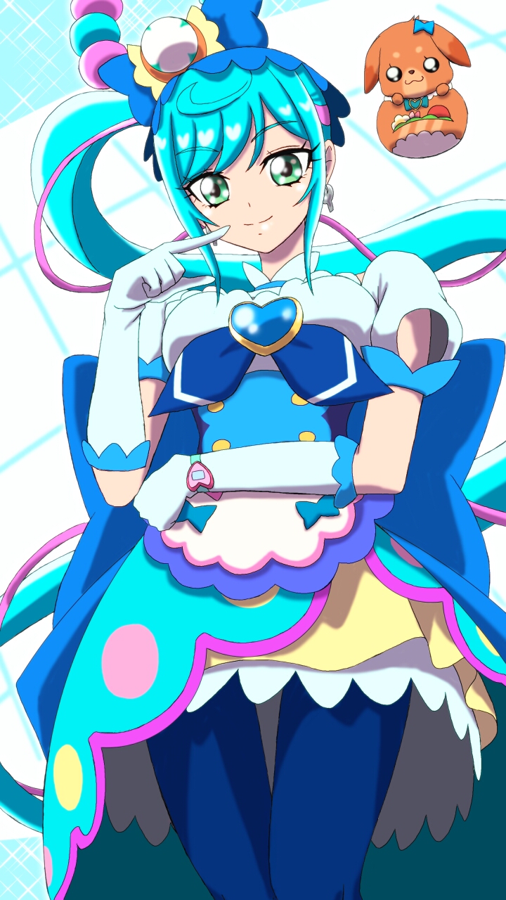 1girlback bowblue backgroundblue bowblue hairblue pantyhosebowbreastsbroochdressearringsglovesgreen eyeshair bowhair ringsheartheart broochjewelrylong hairlooking at viewermagical girlmedium dresspantyhoseside ponytailsingle hair ringsmilevery long hairwhite gloves