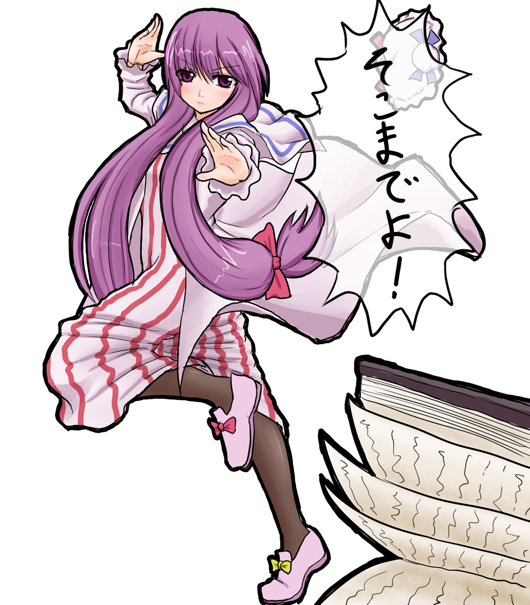 1girlbowfemale focusfighting stancefull bodyhair ribbonhatlong hairlow-tied long hairpantyhosepink bowpink shoespurple eyespurple hairribbonshoessimple backgroundsolostandingstanding on one legtext focusunworn hatunworn headwearvery long hairwhite background