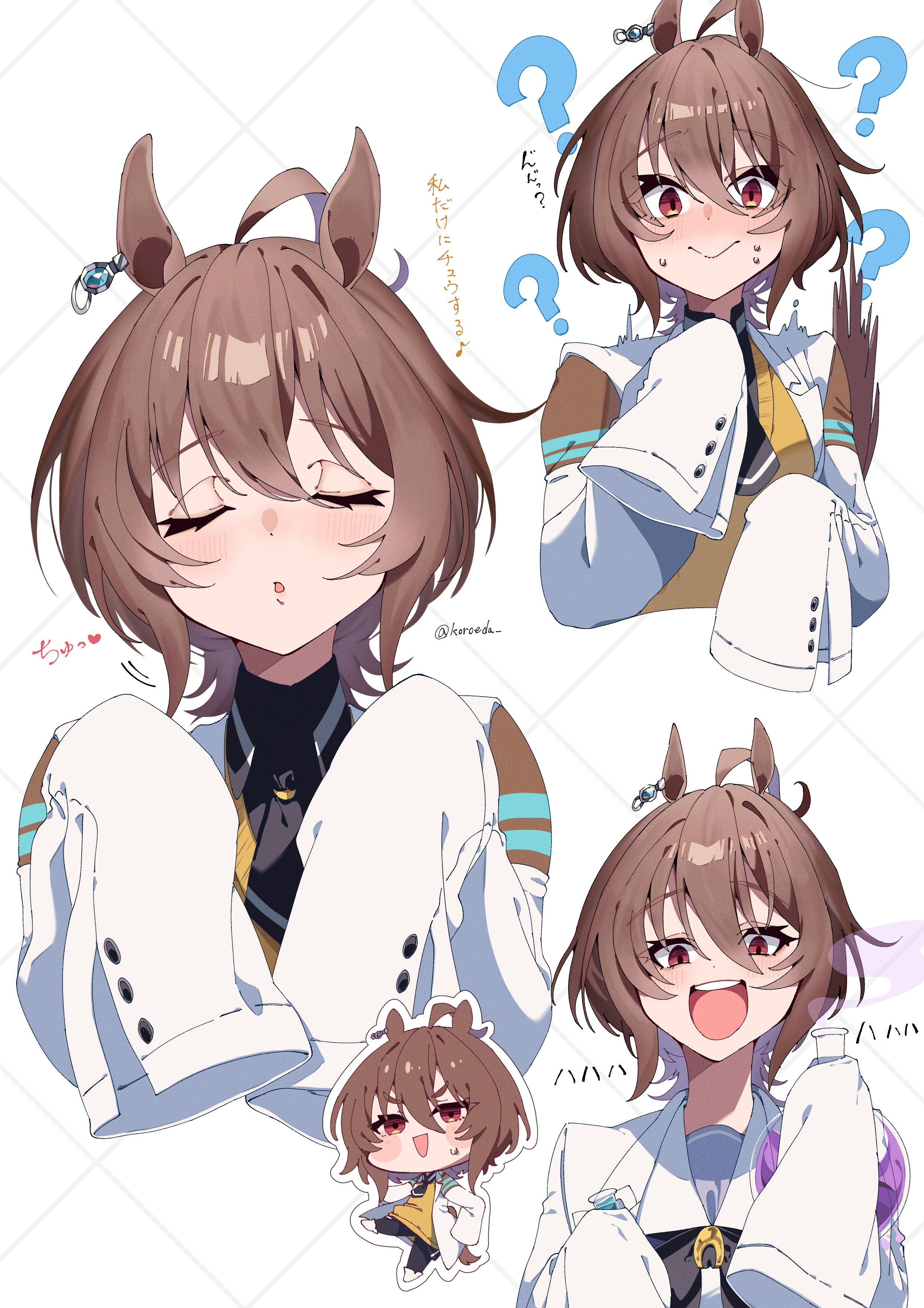 1girlanimal earsblack necktieblack shirtbrown hairclosed eyesclosed mouthhair between eyesholdingholding vialhorse earshorse girllab coatlooking at viewernecktieopen mouthred eyessailor collarschool uniformshirtshoesshort hairsleeves past fingerssleeves past wristssolosweatsweaterteethtracen school uniformupper teeth onlyvialwhite sailor collarwhite shoeswolf cutyellow sweater