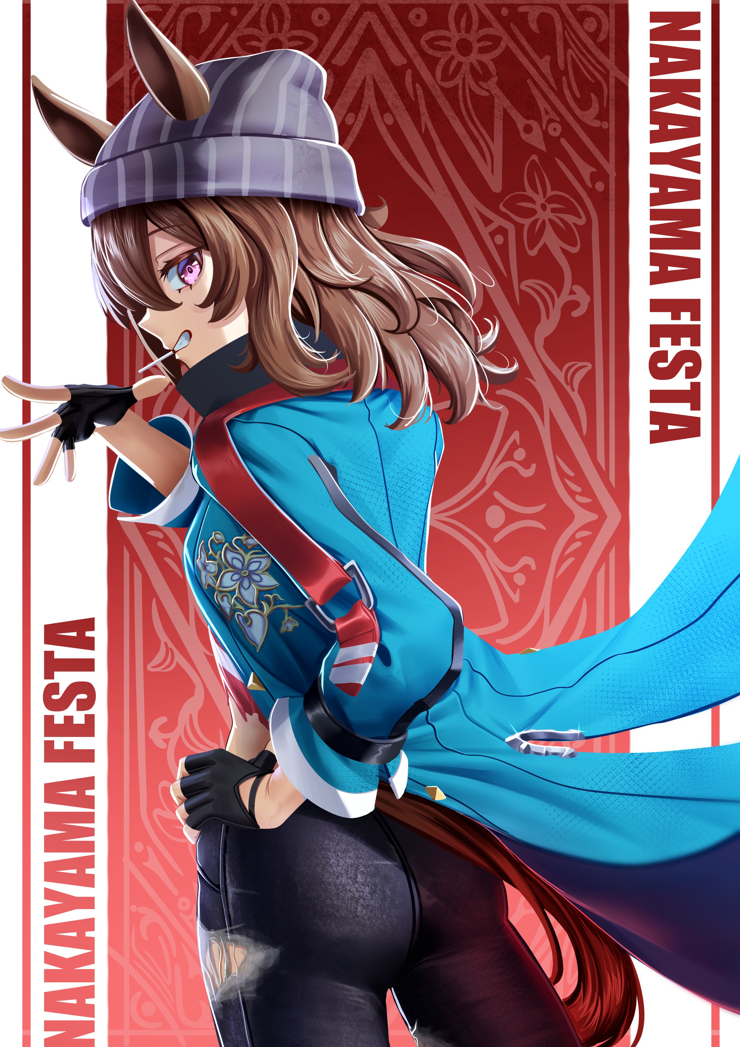 1girlanimal earsbeaniebelt buckleblack glovesblack pantsblue jacketbrown hairbucklecandyears through headwearfingerless glovesfloral printfoodglovesgrey hathathorse earshorse girlhorse tailjacketlollipoplong sleeveslooking at viewermedium hairpantspurple eyessideways glancesmilesolotailtorn clothestorn pants
