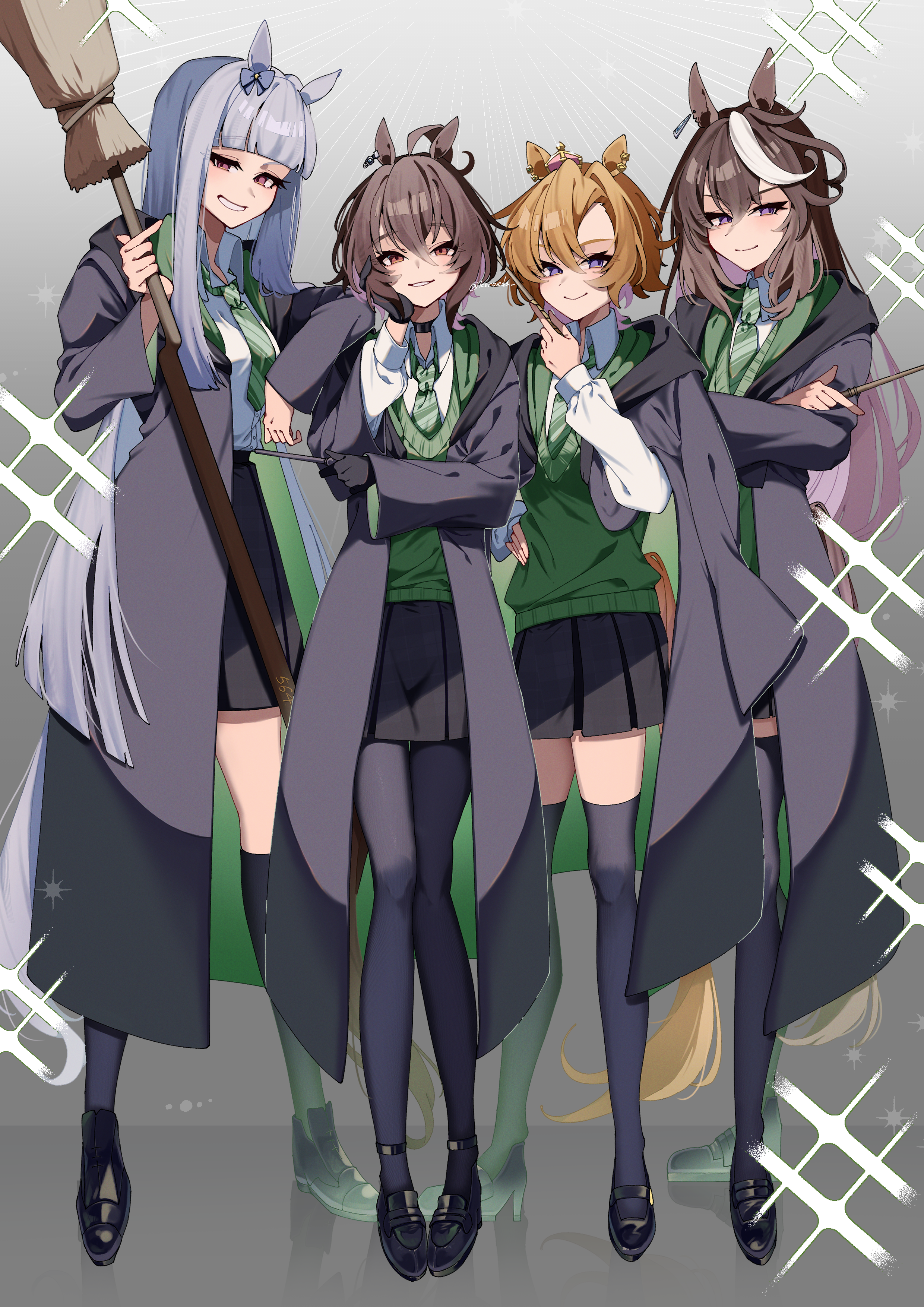 4girlsalternate costumeanimal earsblack coatblack glovesblack pantyhoseblack shoesblack thighhighsblunt bangsblushbroombrown hairclosed mouthcoatcollared shirtglovesgreen necktiegreen sweaterhair between eyeshand on own faceholdingholding broomhorse earshorse girlhorse taillong hairmultiple girlsnecktieorange hairpantyhoseparted lipspurple eyesred eyesshirtshoesshort hairsidelockssmilesweatertailthighhighswhite hairwhite shirtwolf cutzettai ryouiki