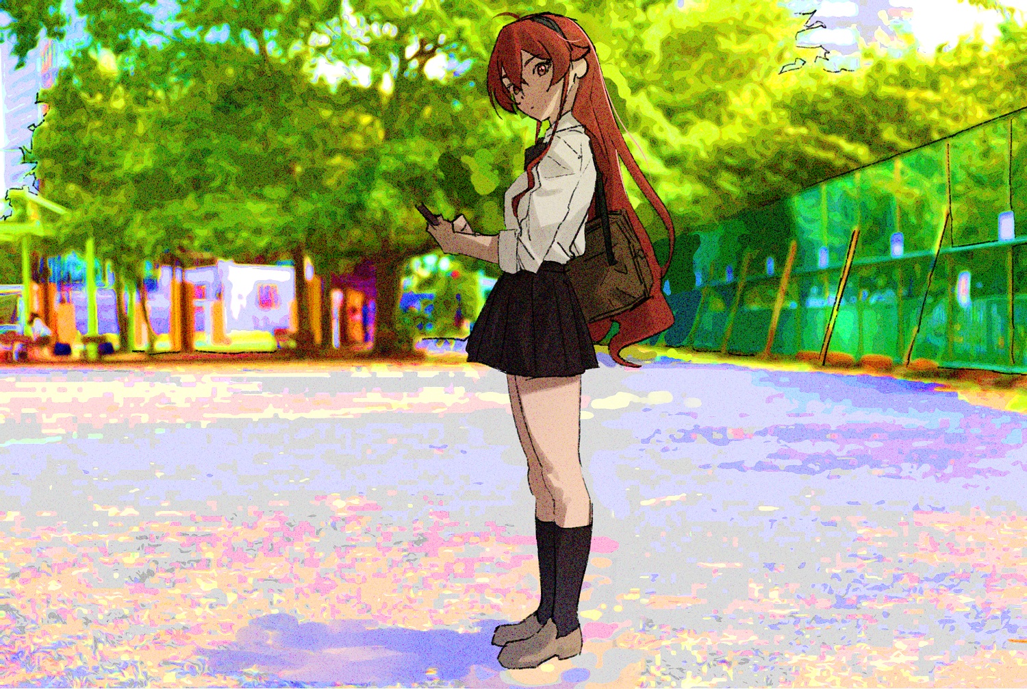 1girlbagblack hairbandblack skirtblack socksbrown shoesfull bodyhair between eyeshairbandholdingholding phonekneehighslong hairlooking at vieweroutdoorsphonered eyesred hairshirtshoesskirtsocksstandingwhite shirt