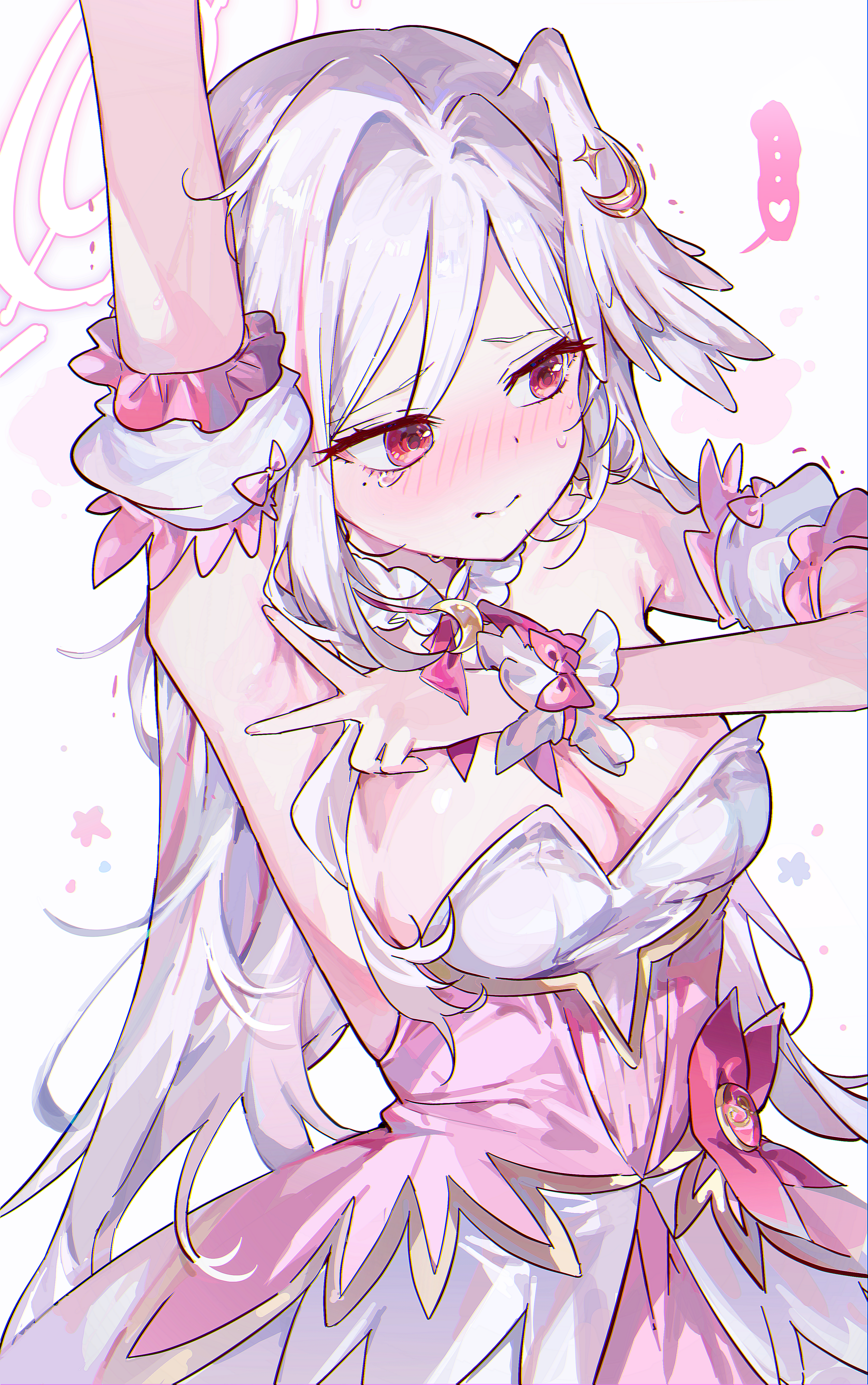 1girlalternate costumearm uparmpitsbare shouldersblushbreastscleavageclosed mouthdetached sleevesdresshalohead wingslarge breastslong hairlooking to the sidemagical girlpink dresspresenting armpitpurple halored eyessidelockssingle wingsmilesolostraplessstrapless dresssweatwhite hairwhite wingswings