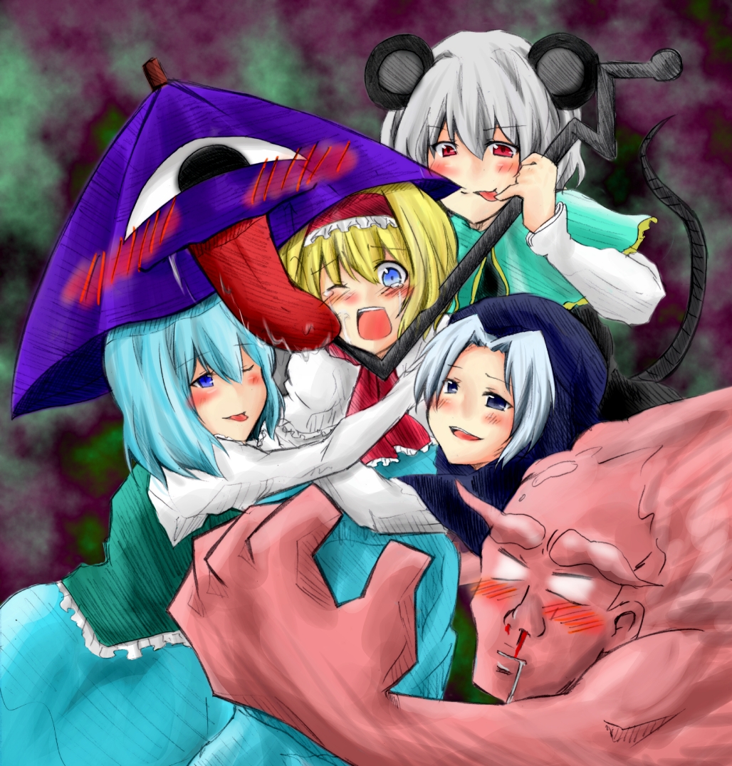 :p4girlsanimal earsblonde hairbloodblue eyesblue hairblushhoodkarakasa obakemouse earsmultiple girlsnosebleedone eye closedred eyessalivatailtearstonguetongue outumbrellawinkyou gonna get raped