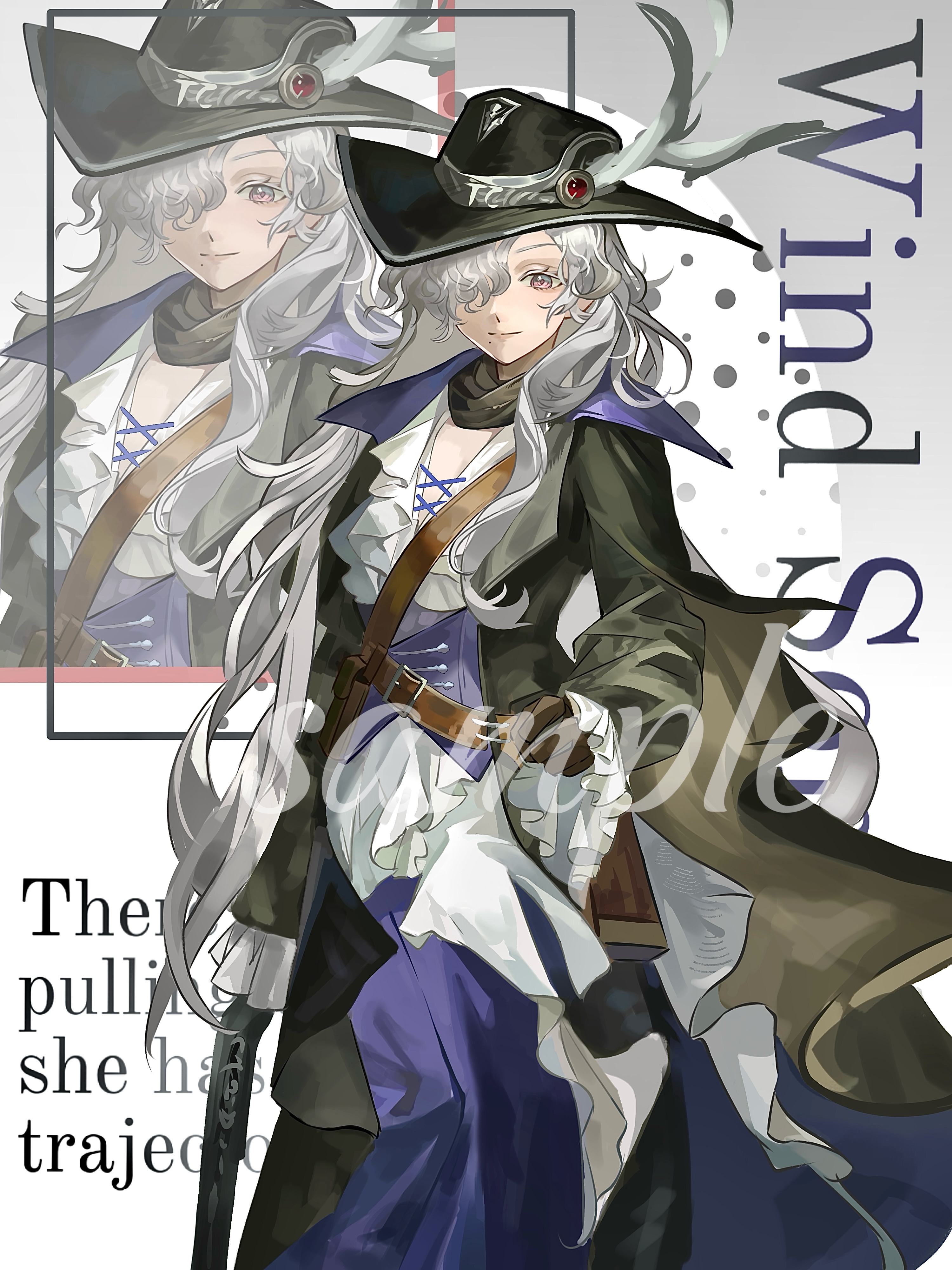 1girlblack coatblack hatcharacter namecoatenglish textgunhair over one eyehatholdingholding gunholding weaponlong hairlong skirtofficial alternate costumeone eye coveredpurple eyespurple skirtsample watermarkshirtskirtsmilesoloupper bodywatermarkweaponwhite hairwhite shirtwu fuzuoyong