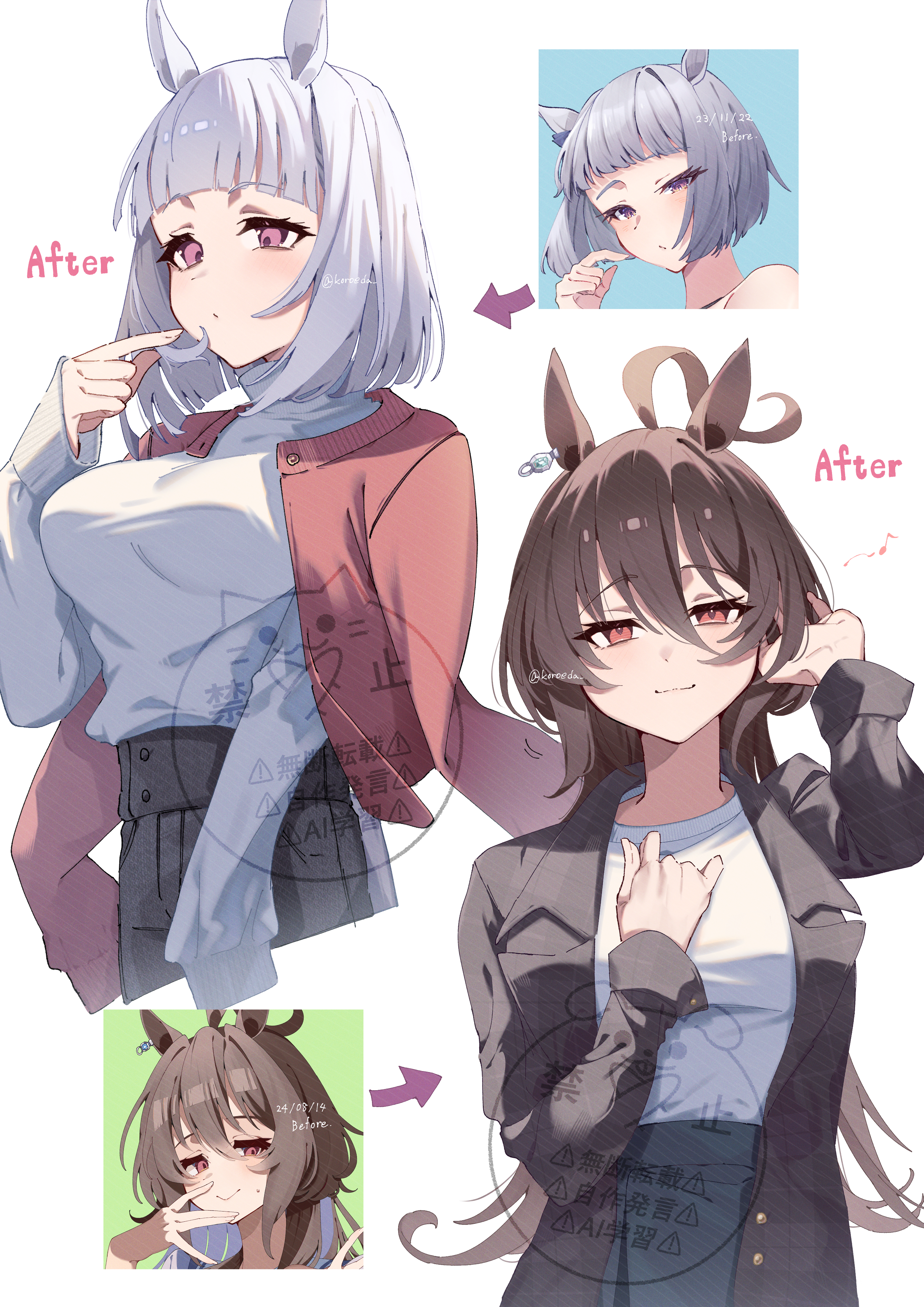 2girlsahogealternate costumealternate hair lengthalternate hairstyleanimal earsblack skirtblunt bangsblushbrown eyesbrown jacketclosed mouthgrey hairhair between eyeshand in own hairhorse earshorse girlhorse tailjacketjacket on shoulderslong hairlooking at viewermultiple girlsplaying with own hairpurple eyesred eyesred jacketshirtshort hairskirtsmiletailturtleneckturtleneck shirtwhite shirt