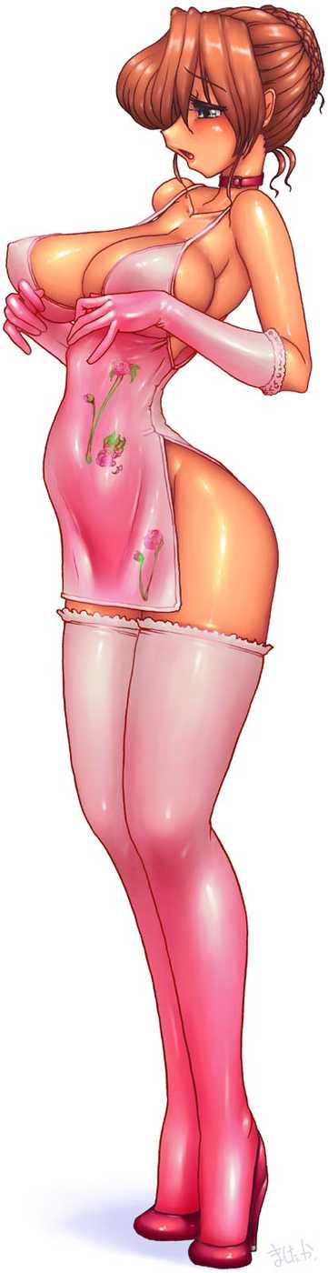 blushbreastsbrown hairchinese clothescleavagecollargloveshigh heelshuge breastsopen mouthshoesside slitsideboobthighhighs