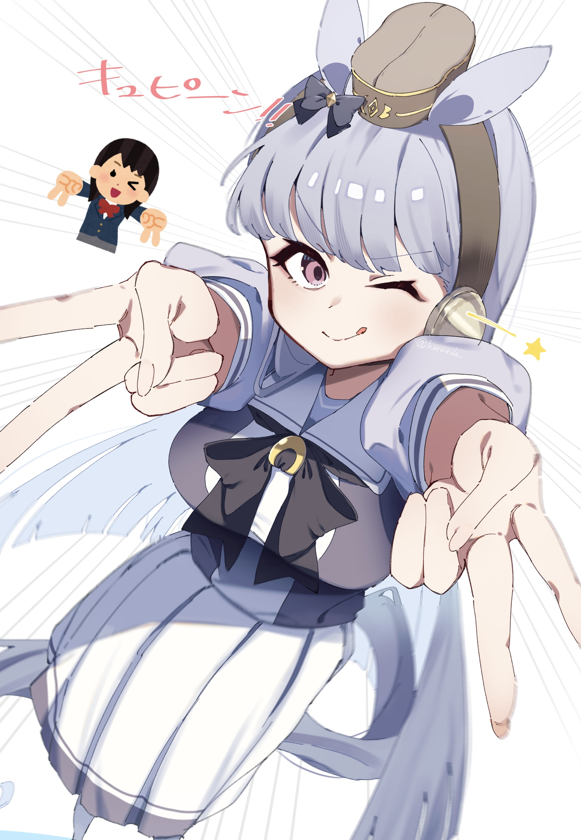 1girlanimal earsblack bowblushbowbrown hatclosed mouthdouble vearmuffsgrey hairhair bowhathorse earshorse girlhorse taillong hairlooking at viewerone eye closedpurple eyespurple shirtshirtshort sleevesskirtsmilesolotailtonguetongue outvwhite skirt
