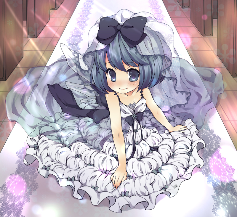 1girlblue eyesblue hairbridal veilbridedressfemale focusmatching hair/eyesshort hairsmilesoloveilwedding dress