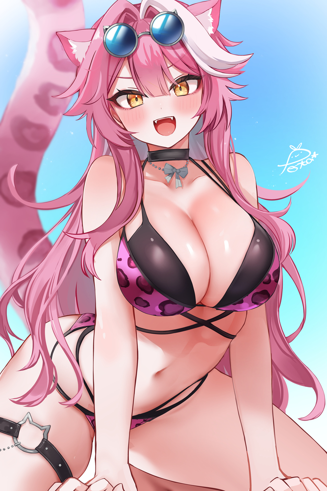 1girlanimal earsanimal printbikiniblack chokerblue skyblushbreastschokerdayfangshair intakeshuge breastsleopard printleopard print bikinilong hairlooking at viewernavelopen mouthpanther earspanther girlpanther tailpink bikinipink hairpink tailprint bikinisignatureskysmilesolostomachsunglassesswimsuittailteeththighsupper teeth onlyvirtual youtuberyellow eyes