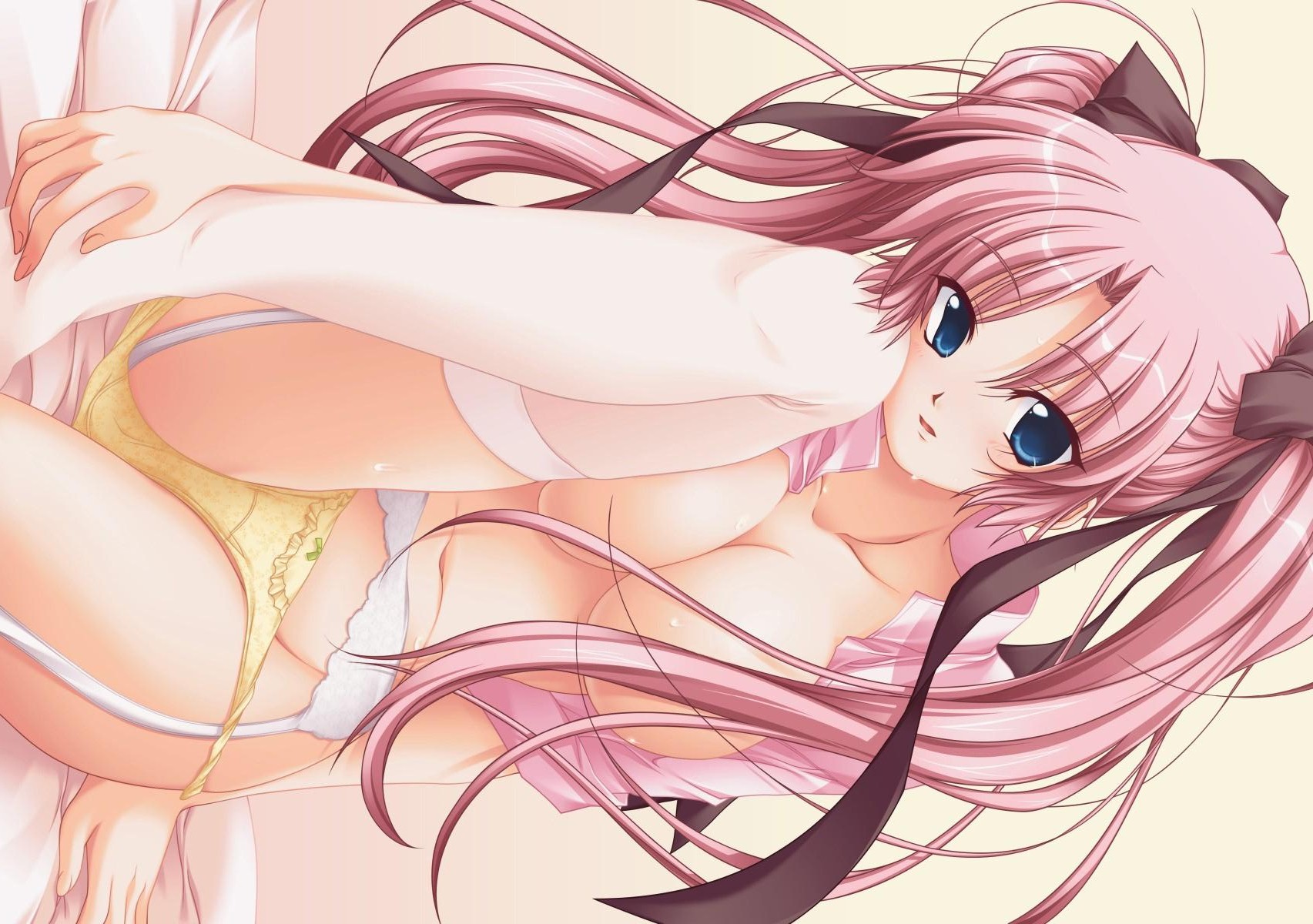 bedblue eyesblushbreastscensoredcleavageconvenient censoringgarter belthair censorhair over breastshair ribbonhead tiltlarge breastslingerielong hairnavelopen clothesopen shirtpantiespink hairribbonshirtsittingsolothighhighstwintailsunderwearyellow panties