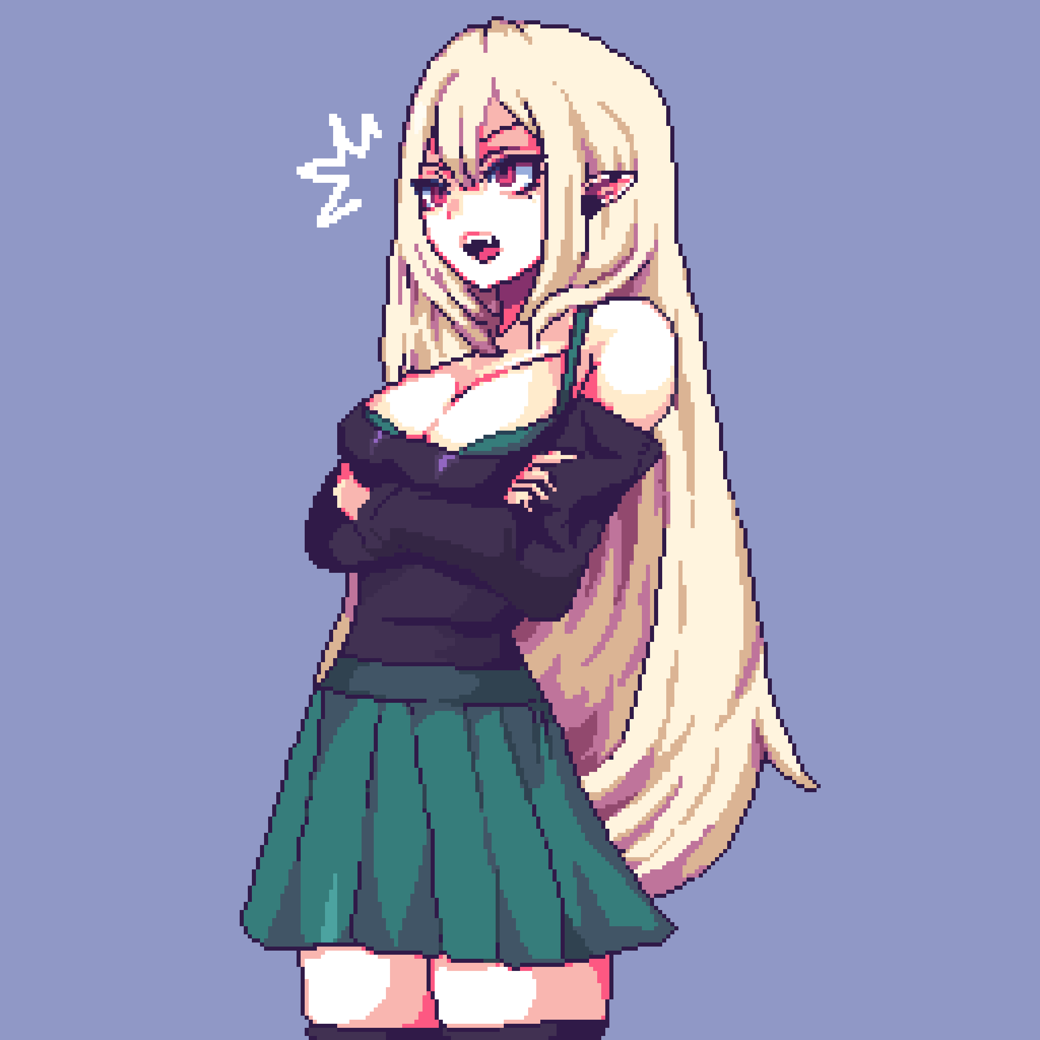 1boy1girlbare shouldersblack shirtblonde hairblue backgroundbreastscowboy shotcrossed armsdouble-parted bangsgreen skirthair between eyeslarge breastslong hairlong sleevesminiskirtmolemole under eyeopen mouthpixel artpleated skirtpointy earsraised eyebrowred eyesshirtsimple backgroundskirtsolothighhighszettai ryouiki