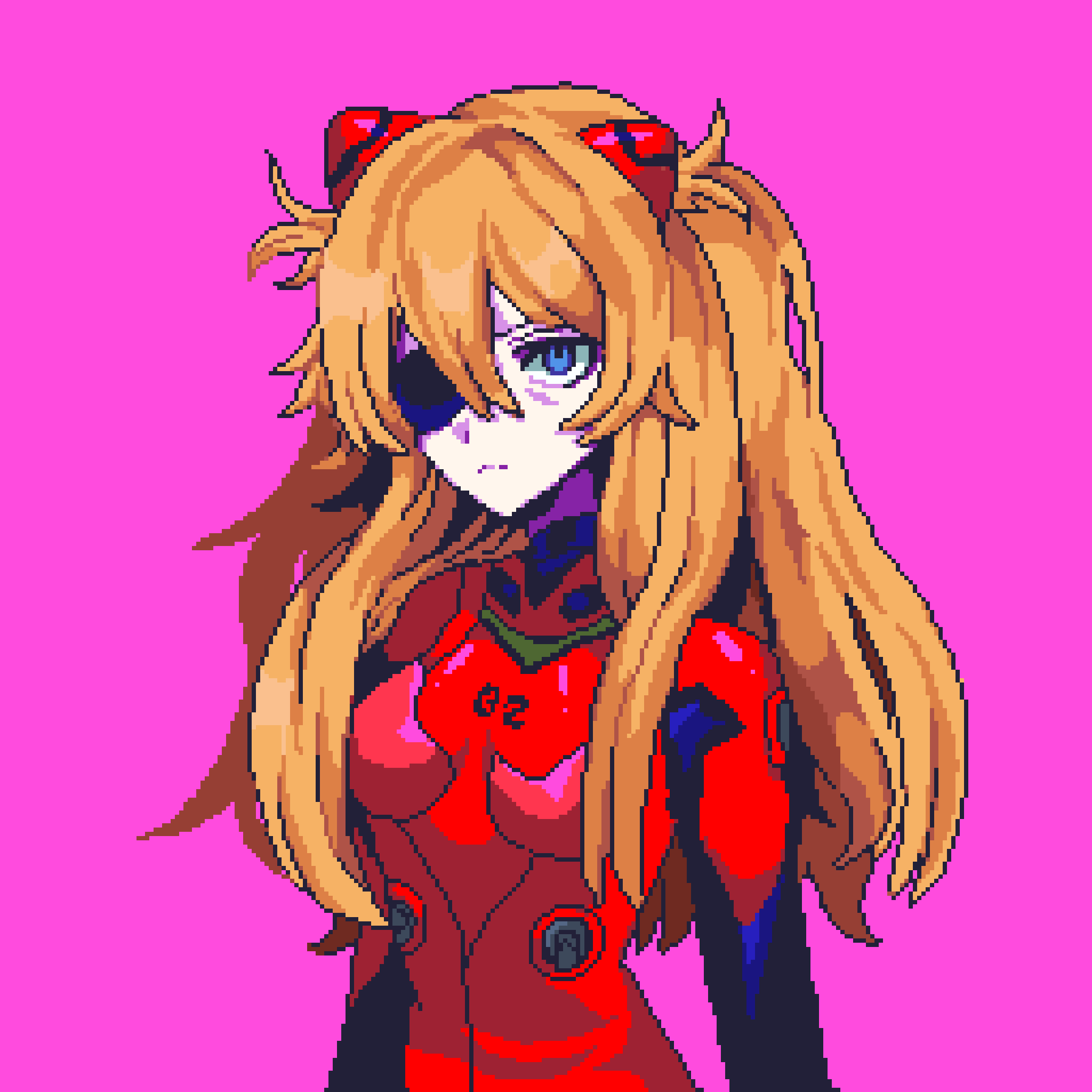 1girlannoyedblue eyesbodysuitbreastsclosed mouthdouble-parted bangseyepatchhair between eyeshair ornamentlong hairlooking at viewerone eye coveredorange hairpink backgroundpixel artred bodysuitsimple backgroundsmall breastssoloupper body