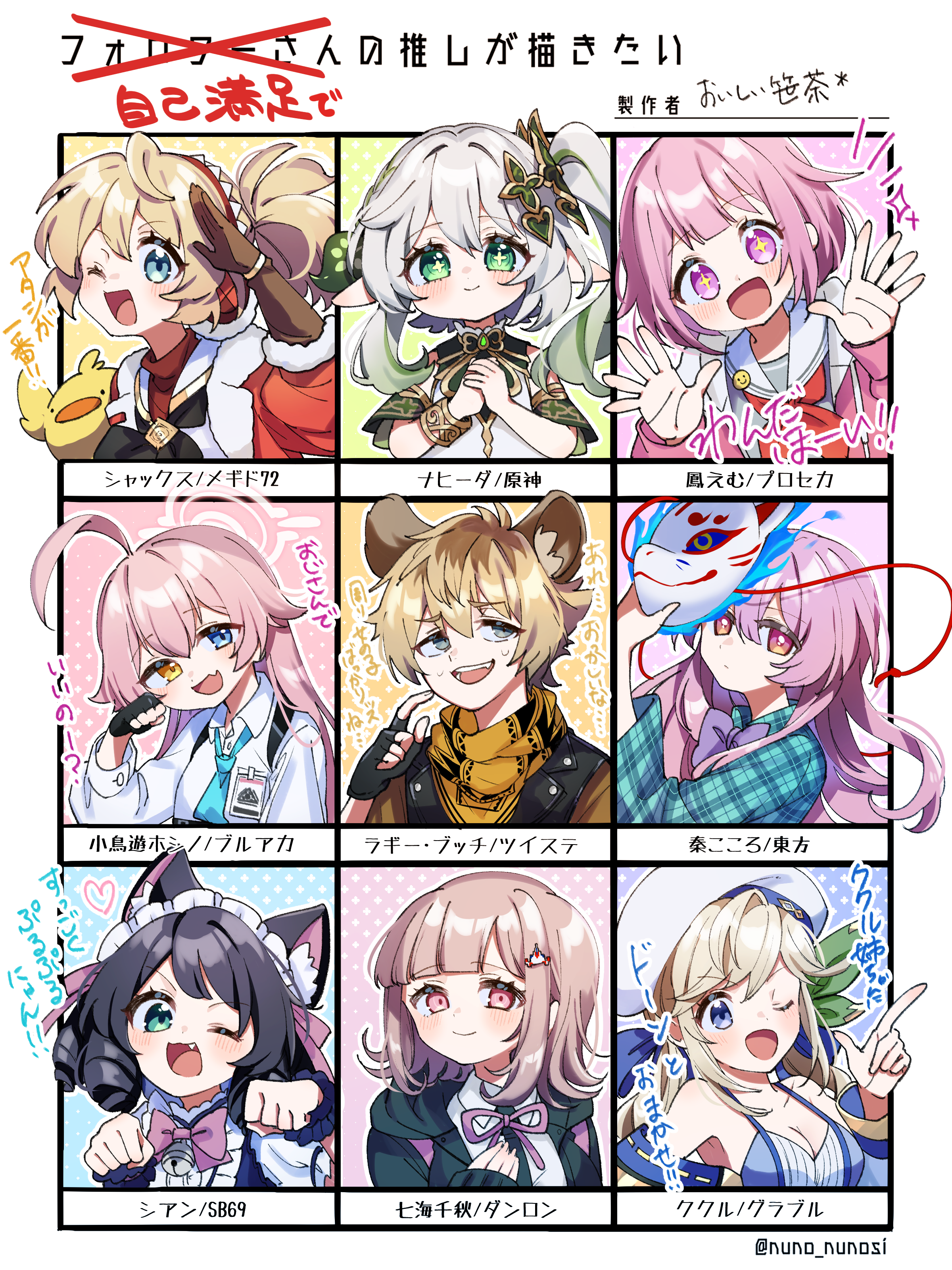cucouroux (granblue fantasy)cyan (show by rock!!)hata no kokorohoshino (blue archive)nahida (genshin impact)nanami chiakiootori emuruggie bucchishax (megido72)