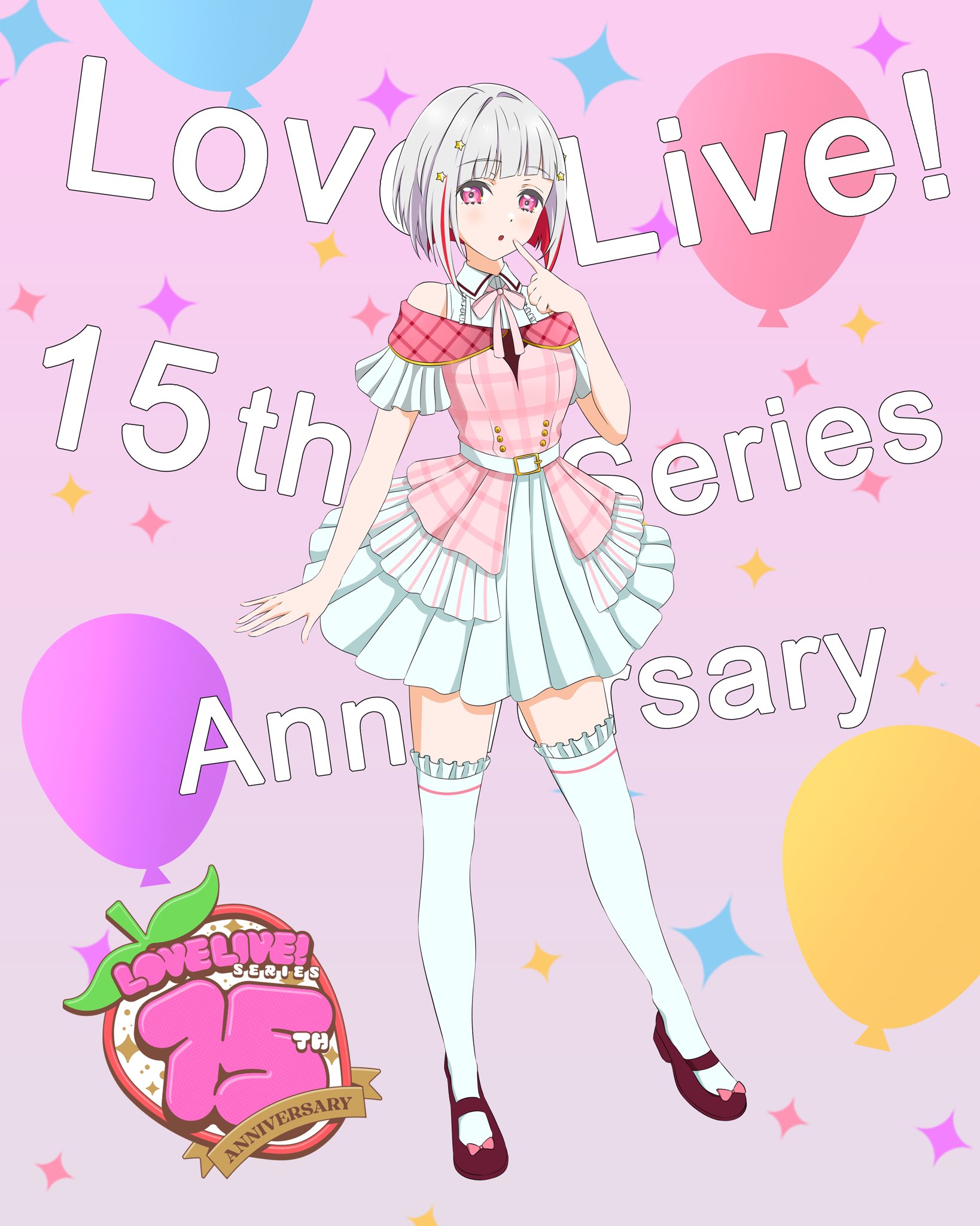 1girlalternate costumeballoonbare shouldersbob cutcolored inner hairdiagonal bangsdressfrilled thighhighsfrillsfull bodygrey hairhair intakeshair ornamentinverted boblove live! series 15th anniversary costumemary janesmulticolored hairoff shoulderparted lipspink backgroundpink ribbonpink shirtred hairred shoesribbonshirtshoesshort hairsleevelesssleeveless dresssolosparkle backgroundstar (symbol)star hair ornamentstreaked hairtext backgroundthighhighsvirtual youtuberwhite dresswhite thighhighs