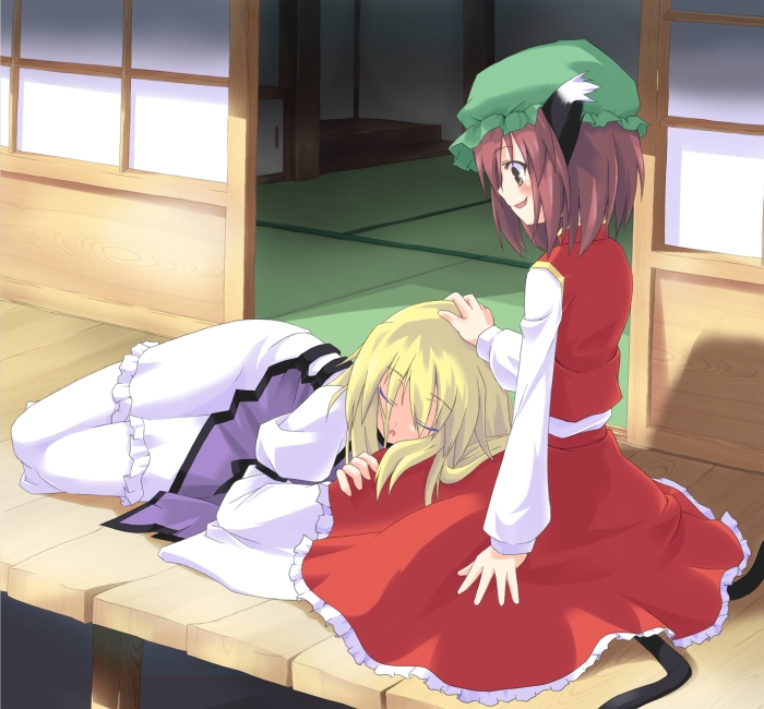 2girlsanimal earsblonde hairblushbrown haircat earscat girlfemale focushatheadpatlap pillowmultiple girlsno headwearrole reversalsleeping