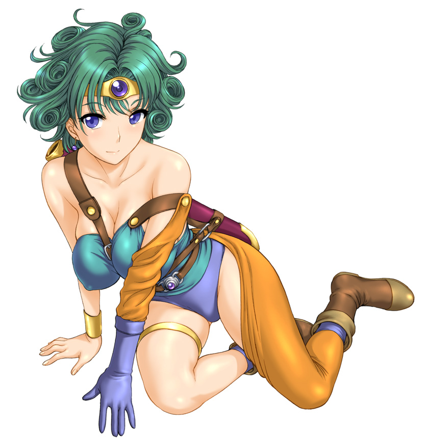 1girlbare shouldersblue eyesbootsbreastscircletcleavagecurly hairelbow glovesfemale focusglovesgreen hairlarge breastsleotardsolostrapstrap slip