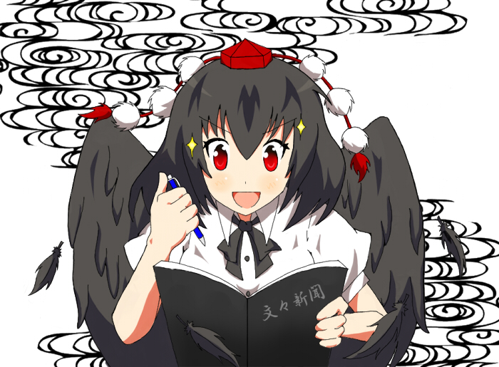 1girlblack hairblack wingsbookfemale focushatlooking downopen mouthpenred eyesshort hairsmilesolotokin hatwings