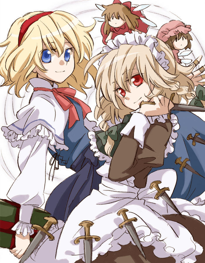 dairi, tsurumaki maki, voiceroid, commentary request, highres, large variant set, variant set, > <, 1girl, ankle boots, antenna hair, bare shoulders, black sleeves, blonde hair, boots, bow, bowtie, breasts, cleavage, cleavage cutout, clothing cutout, collared shirt, detached sleeves, facing viewer, hair between eyes, hand on own hip, headset, impossible clothes, impossible shirt, kneehighs, layered shirt, long hair, long sleeves, medium breasts, miniskirt, open mouth, red boots, red bow, red bowtie, red shirt, red skirt, red socks, red thighhighs, shirt, single sock, single thighhigh, skirt, skirt set, socks, solo, tachi-e, thighhighs, very long hair, white shirt, wing collar