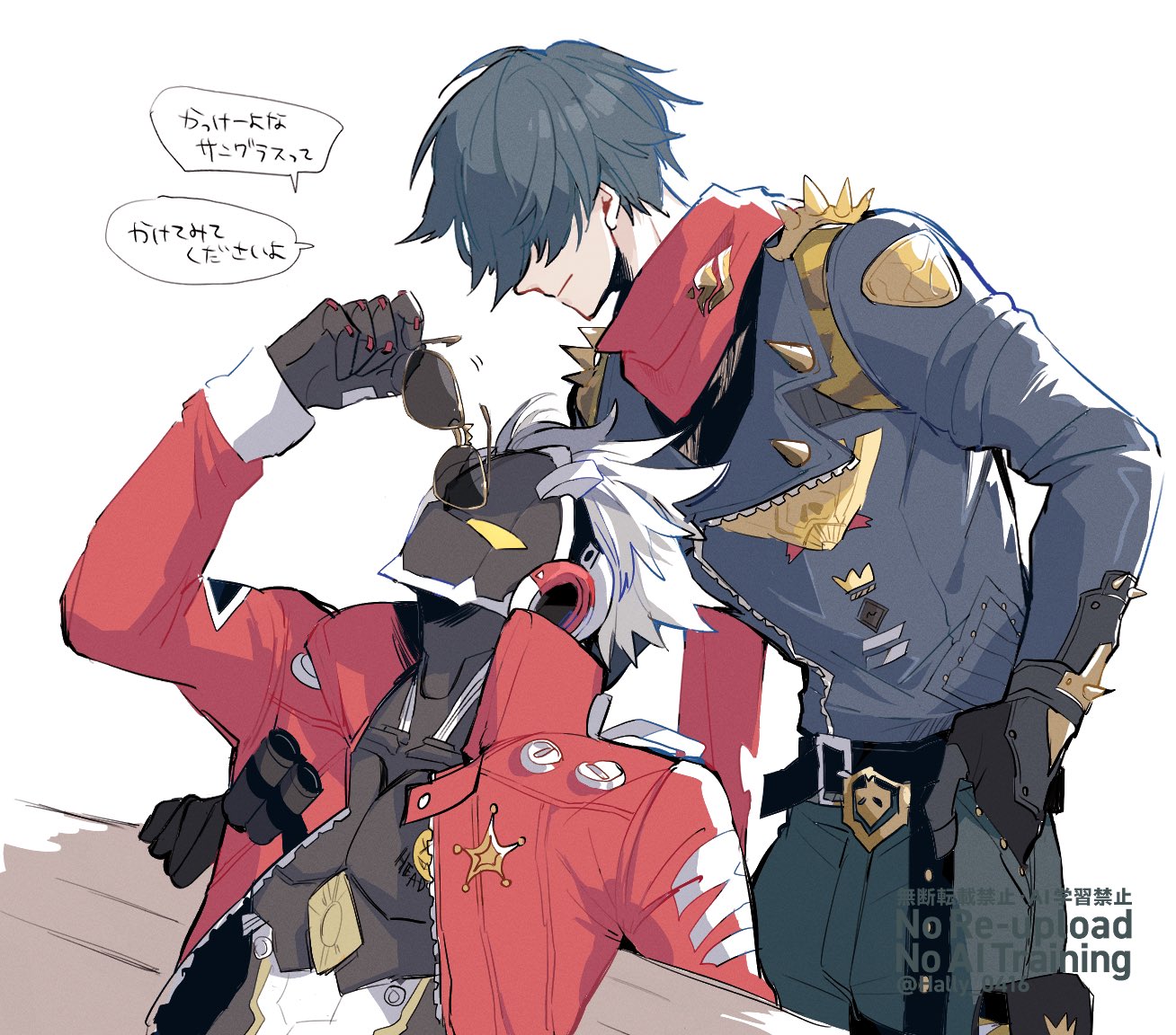 2boysbeltbenchblack shirtclosed mouthclothed robotcyborgfrom sidegreen hairgreen pantshair over one eyehand in pockethand on benchholdingholding removed eyewearhumanoid robotjacketleaning forwardleatherleather jacketmechanical armsmechanical legsmetal skinmultiple boysno mouthon benchpantspouchred jacketred scarfrobotrobot boyscarfsheriff badgeshirtshort hairshoulder spikessimple backgroundspeech bubblespiked jacketspikesstudded beltstudded glovessunglassesthigh pouchtorn clothestorn scarftorn shirtunworn eyewearunzippedwhite backgroundwhite hairyellow eyes