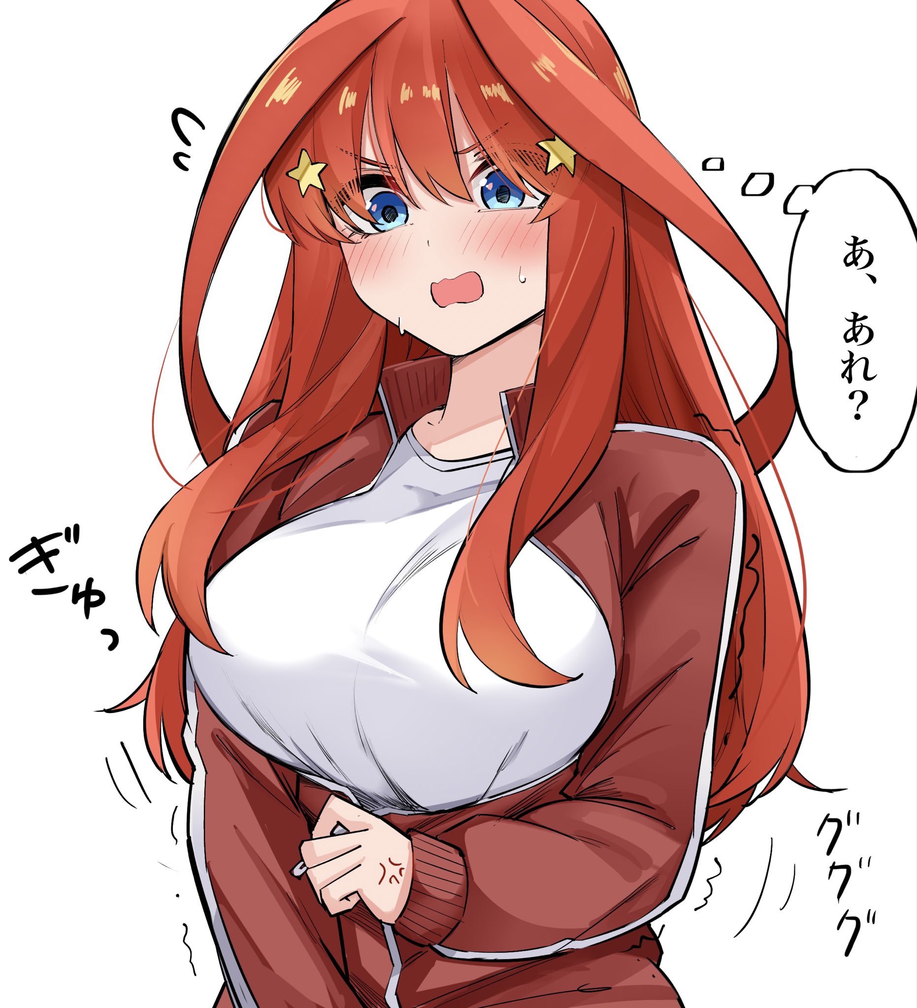 1girlanger veinblue eyesblushbreastsgym uniformhair ornamentjacketlarge breastslong hairopen mouthpartially unzippedred hairred jacketshirtshort hairsimple backgroundsolospeech bubblestar (symbol)star hair ornamentsweatdropthought bubbletrack jacketundersized clothesupper bodywhite backgroundwhite shirt