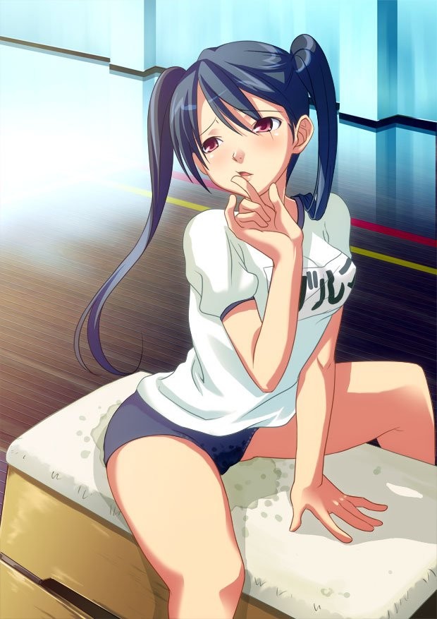 1girlblue burumablue hairblushbreastsburumafeet out of framefemale focusfinger to mouthgymgym floorgym uniformlipslong hairname tagnoseopen mouthpeeingpeeing selfpublic indecencypuddlepurposeful wettingred eyesshadowshirtshort sleevessittingsmall breaststonguetouching lipstwintailsvaulting horsewetwet burumawet clotheswhite shirtwooden floor