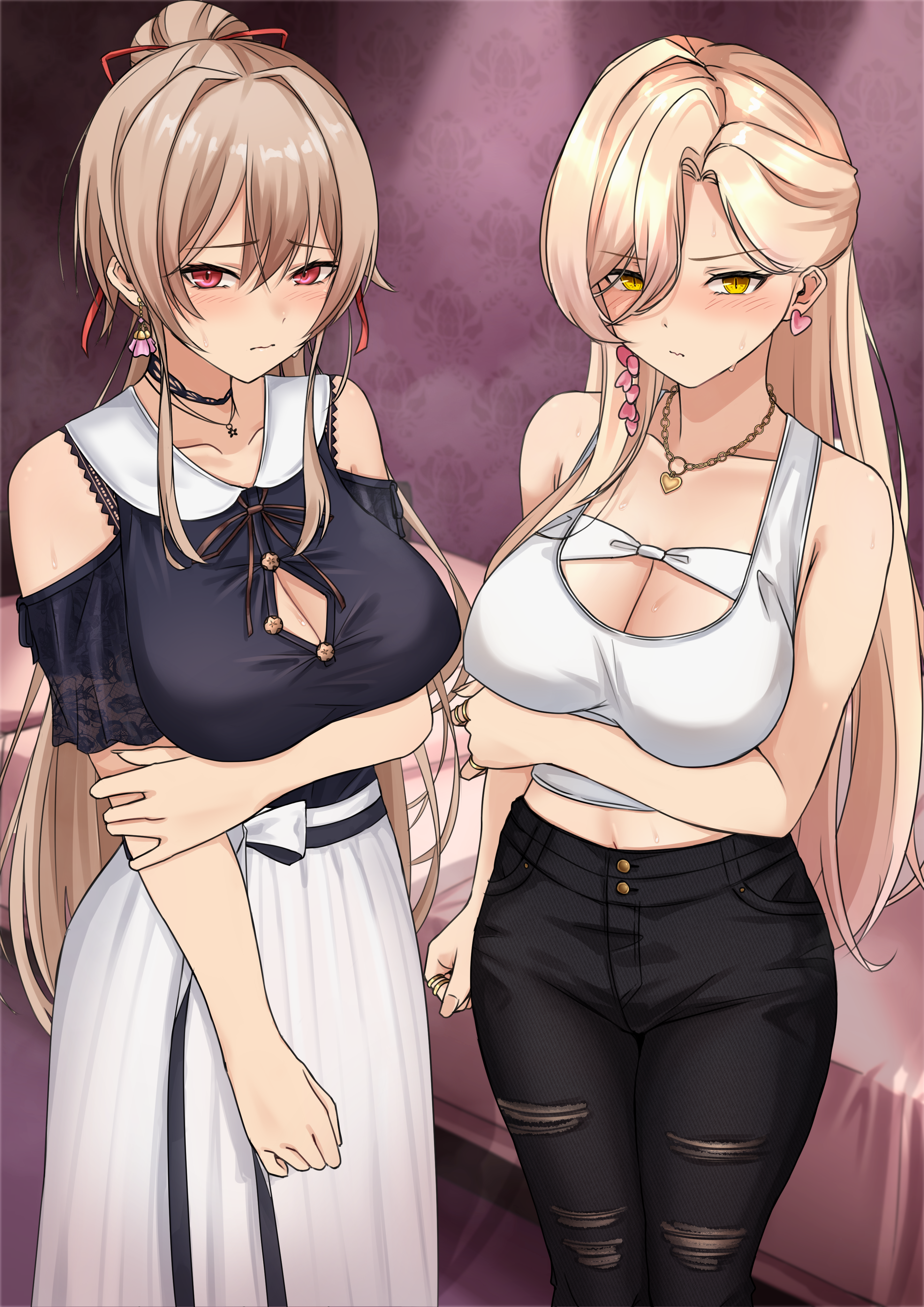 2girlsarm under breastsbedroombetween breastsblack pantsblack shirtbreastsbrown haircleavagecollarbonecondomcondom wrappercrop topearringsheartheart earringshigh ponytailjewelrylarge breastslong hairlooking at viewermidriffmultiple girlsnecklacepantsponytailshirtskirtsweattank toptorn clothestorn pantsv-shaped eyebrowsvery long hairvirtual youtuberwhite skirtwhite tank topyellow eyes