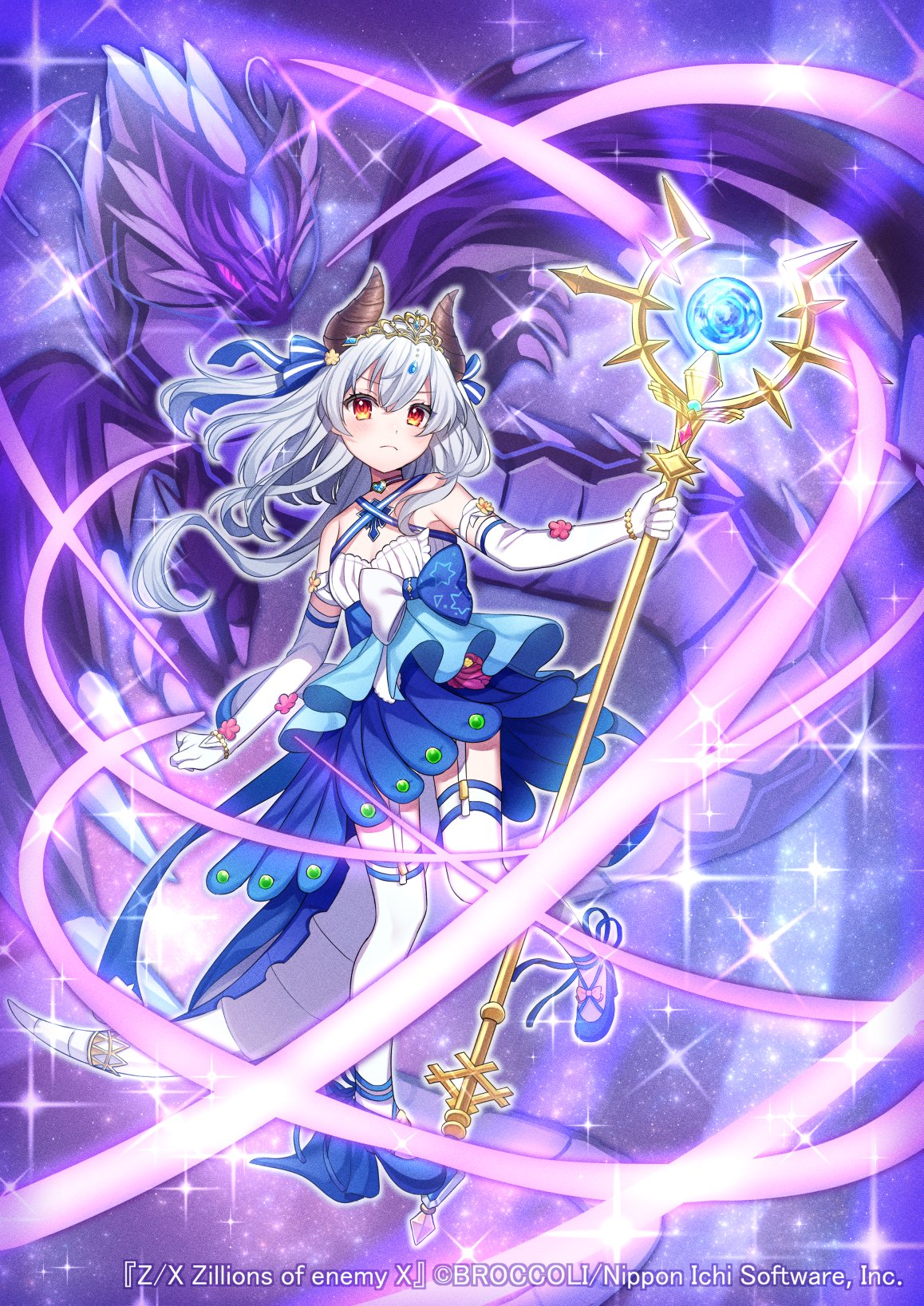 1girlblue dressblue shoesbreastsbrown hornsclosed mouthcopyright noticecrowndragondragon girldragon hornsdragon taildresselbow glovesglovesgrey hairholdingholding staffhornslong hairred eyesshoessmall breastssparklestafftailthighhighswhite gloveswhite thighhighs
