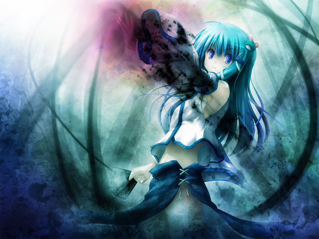 1girlarmpitsblue eyesdetached sleevesfemale focusgradient backgroundgreen hairlong hairmidriffnavelno braofudaskirtsolo