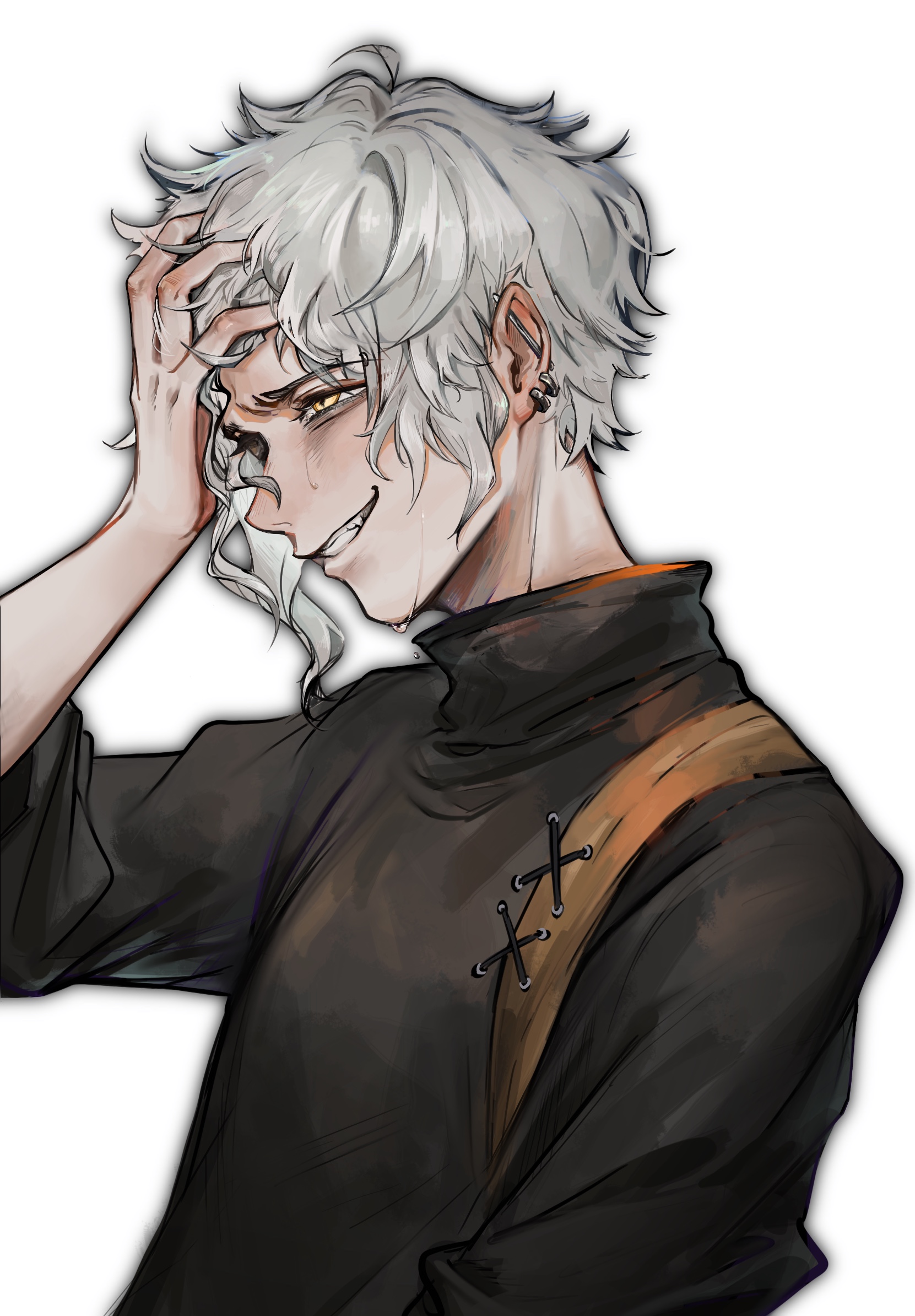 1boybags under eyesbarbell piercingblack shirtear piercingearringsgrey hairhand on own headindustrial piercingjewelrymale focusmedium hairopen mouthpiercingprofileshirtsimple backgroundsmilesolosweatdropupper bodywhite backgroundyellow eyes